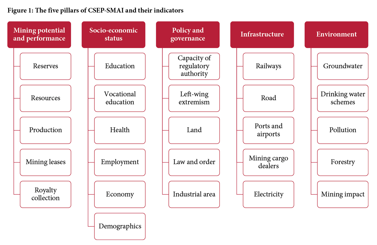 The CSEP-SMAI study involves quantitative and qualitative evaluation of several factors that are central to the mining sector’s business attractiveness and economic viability. The study is based on the five pillars, each having several indicators (see Figure 1). A comprehensive list of sub-indicators and data sources is given in Annex A.1.