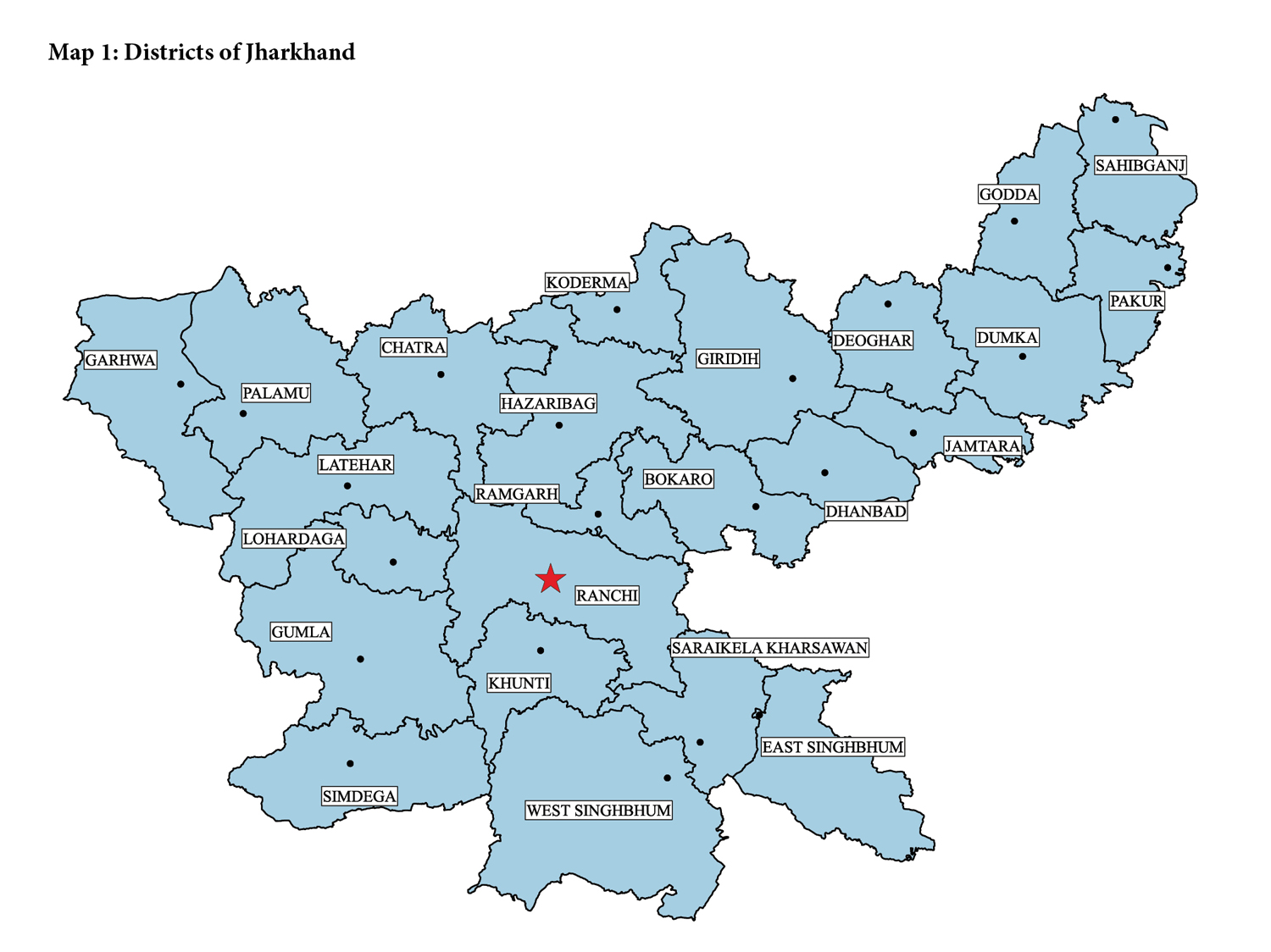 Mining in Jharkhand includes coal and non-fuel mining of major and minor minerals.[1] Mining activity differs across all 24 districts (see Map 1). Thirteen districts—Bokaro, Chatra, Deoghar, Dhanbad, Giridih, Godda, Hazaribagh, Jamtara, Latehar, Pakur, Palamu, Ramgarh, and Ranchi—account for about 26 percent of the total coal inventory in India. In 2018–19, these districts produced 18.5 percent of the total production of coal in the country (Coal Controller’s Organisation, 2020).
