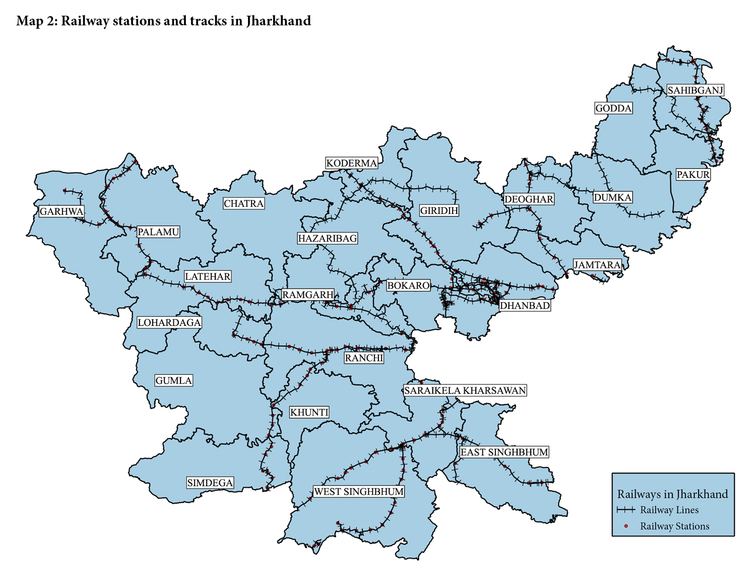 Rail connectivity: The railway density in Jharkhand is 35 km per 1000 sq. km. The districts of Dhanbad, Ramgarh, Sahibganj, and Bokaro have higher railway density, especially Dhanbad at 141 km and Ramgarh at 120 km per 1000 sq. km. Railway density is low (under 10 km per 1000 sq. km) in the districts of Gumla and Chatra.