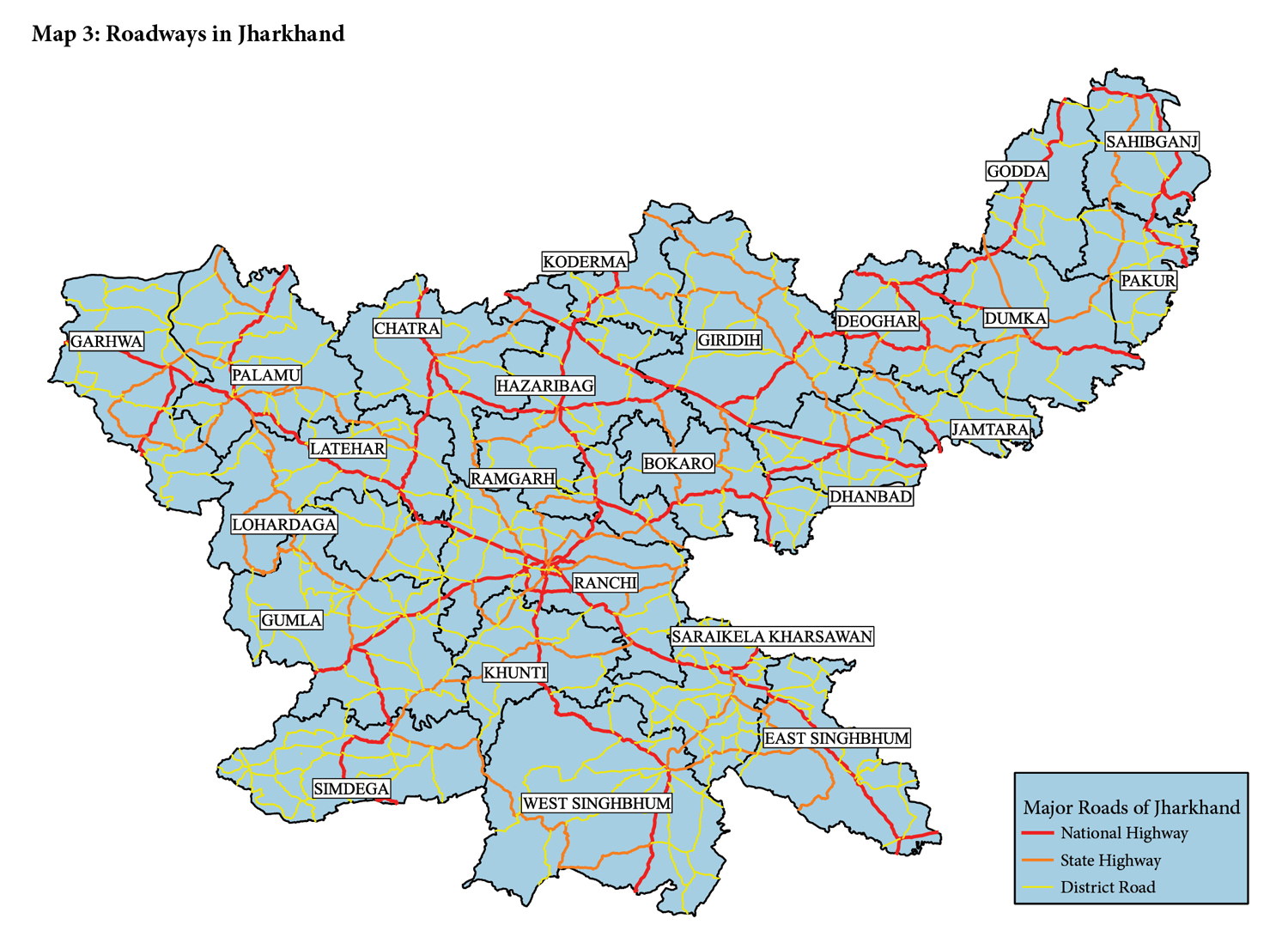Saraikela Kharsawan has the highest road density, followed by Simdega and Dhanbad, while Godda has the lowest road density. Ramgarh has, by far, the highest density of city and village roads, followed by Deoghar and Hazaribagh, with Dumka and Sahibganj performing the worst.