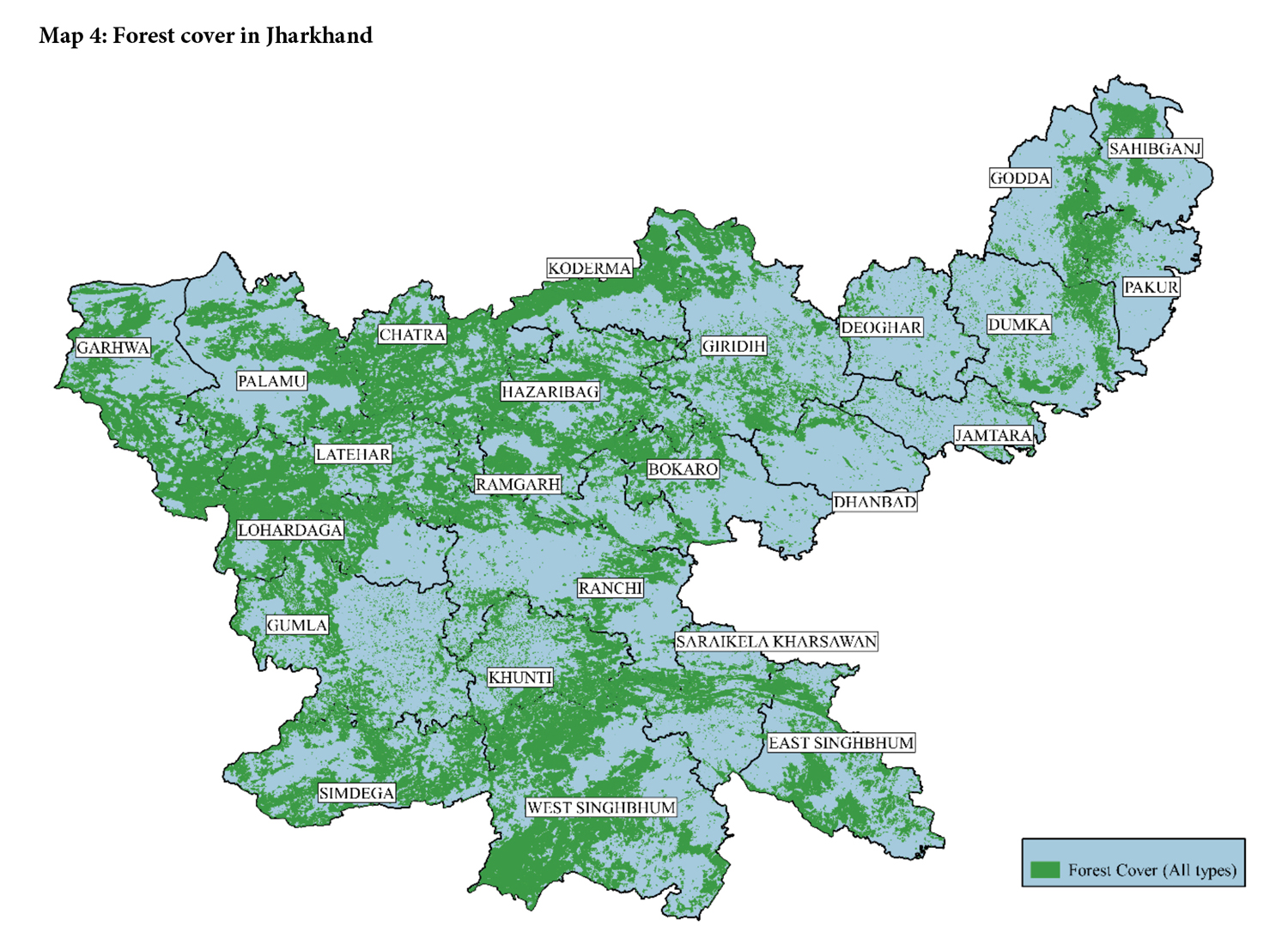 Protecting the forest cover: 29.6 percent of Jharkhand’s total geographic area is covered by forests. Of this, 3.2 percent has very dense forests, 12.2 percent moderately dense forests, and 14.2 percent open forests.[2] The total forestry cover varies across the 24 districts of Jharkhand, from 5.6 percent in Jamtara to 56.1 percent in Latehar. All but four districts experienced an increase in total forestry cover between 2017 and 2019.