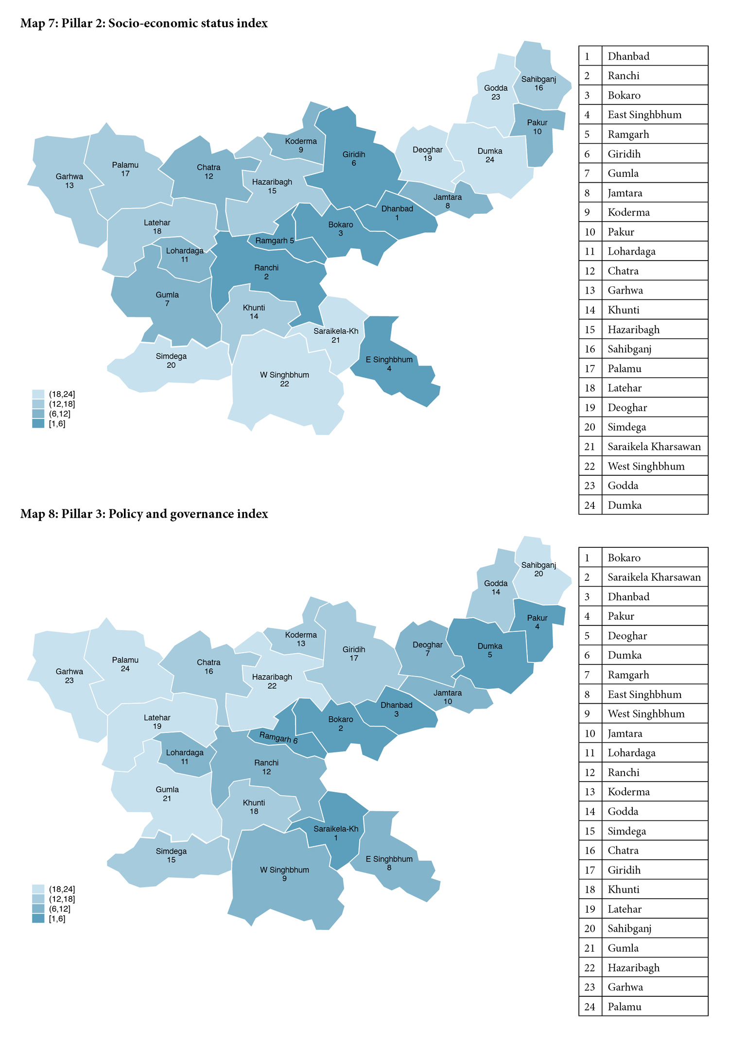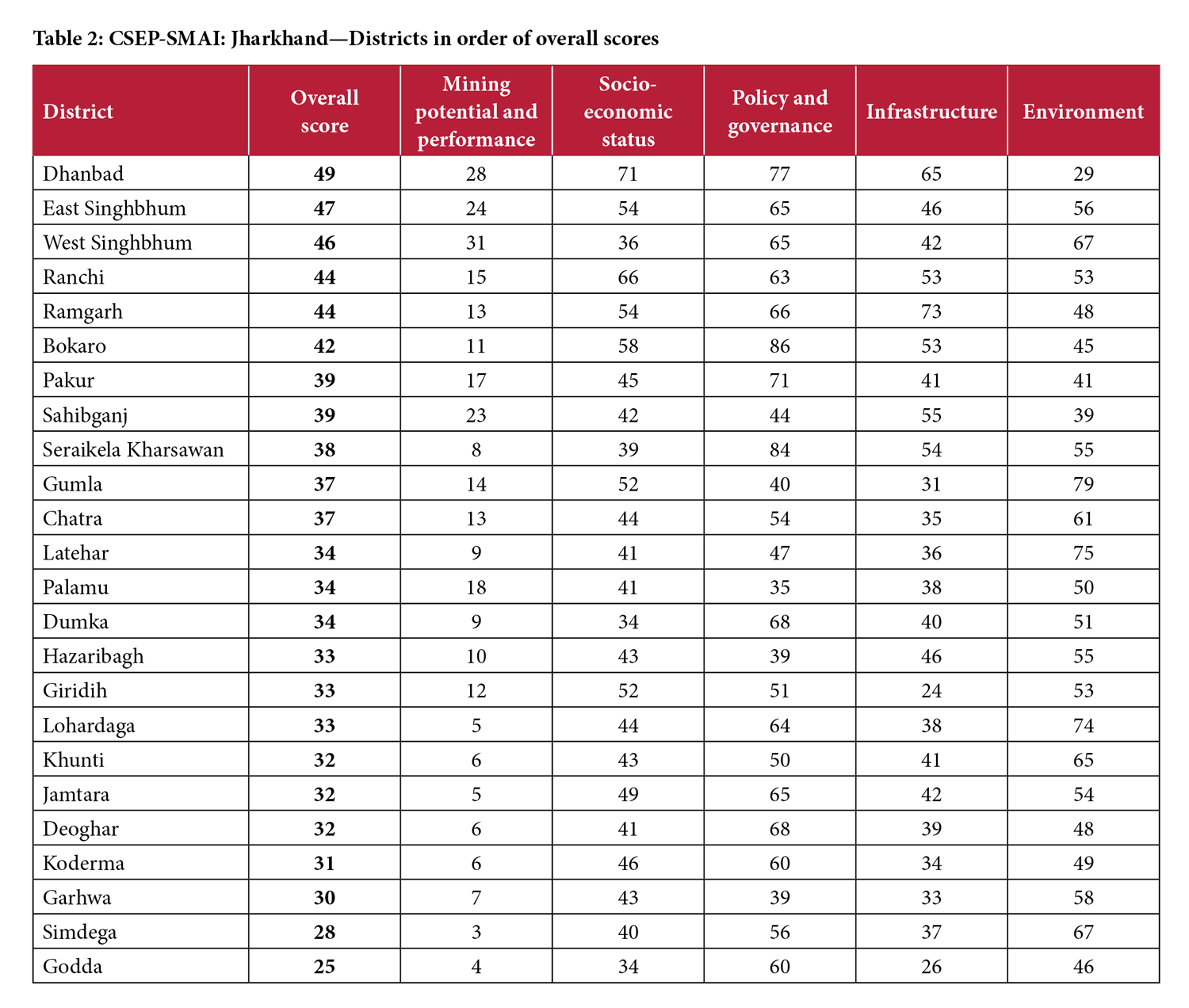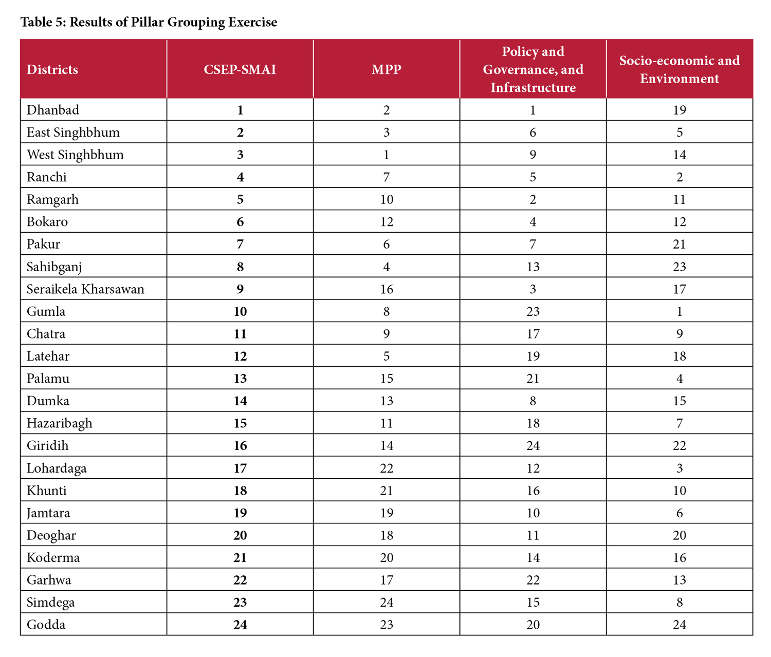 The pillar-wise and overall indices for 24 districts are given in Table 1. The top five districts overall are: Dhanbad (1), East Singhbhum (2), West Singhbhum (3), Ranchi (4) and Ramgarh (5). The five lowest-ranked districts are: Deoghar (20), Koderma (21), Garhwa (22), Simdega (23) and Godda (24). Table 2 provides the scores (pillar-wise and overall) for each district.
