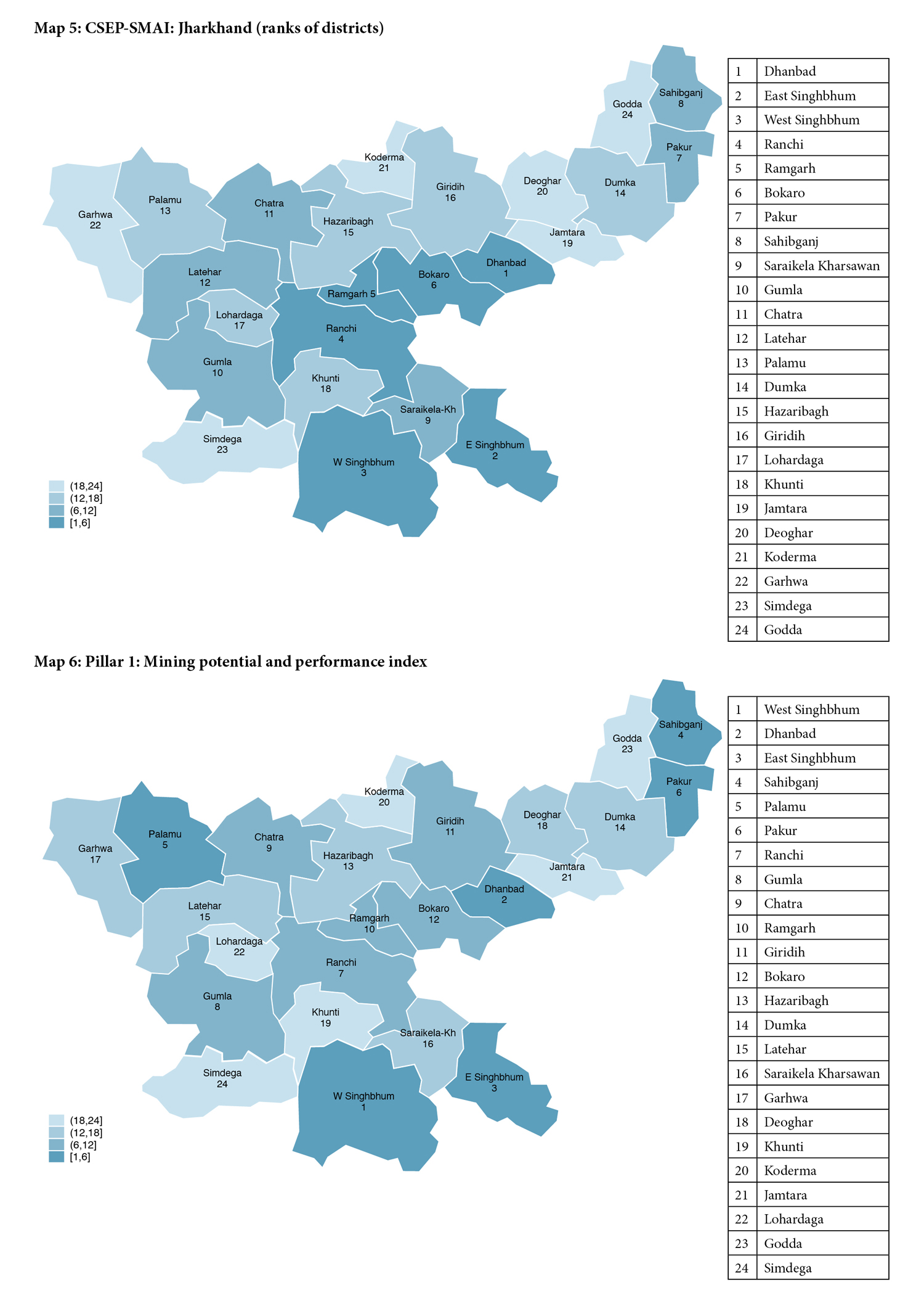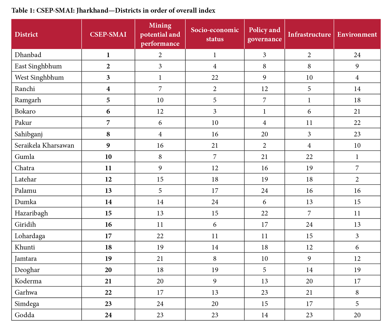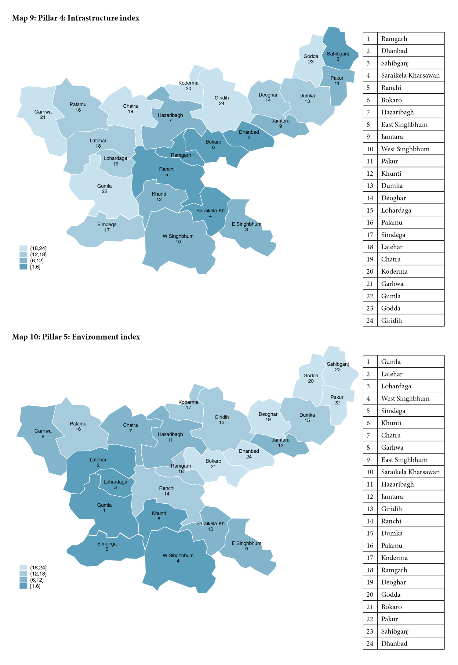The pillar-wise and overall indices for 24 districts are given in Table 1. The top five districts overall are: Dhanbad (1), East Singhbhum (2), West Singhbhum (3), Ranchi (4) and Ramgarh (5). The five lowest-ranked districts are: Deoghar (20), Koderma (21), Garhwa (22), Simdega (23) and Godda (24). Table 2 provides the scores (pillar-wise and overall) for each district.