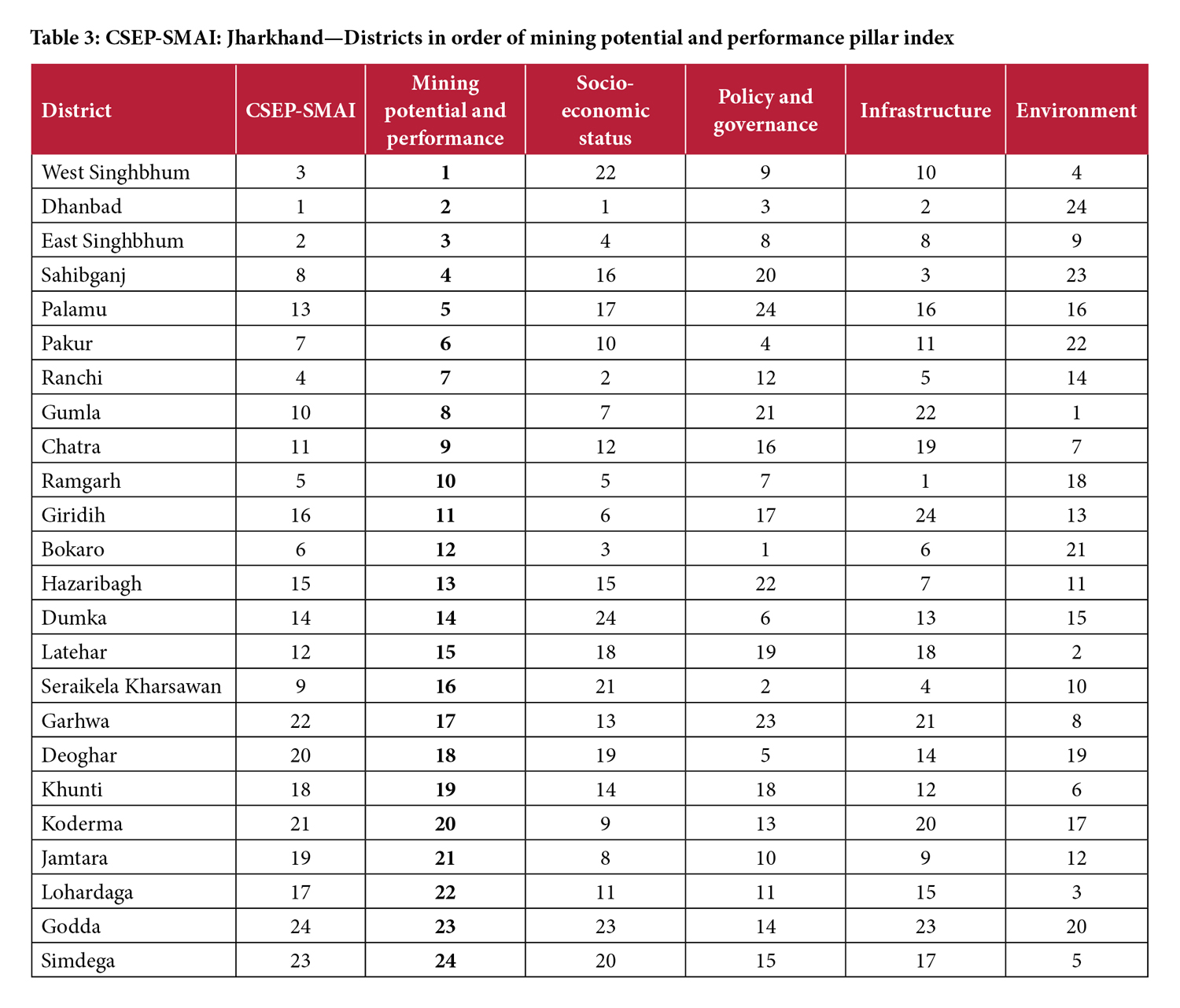 A holistic understanding of mineral resources-led development: The CSEP-SMAI study portrays a holistic overview of 24 districts of Jharkhand with regard to the five pillars. While the mining potential of a district may be an important incentive for mining investments, the miner would also consider the policy and governance, and infrastructure issues. The district government should be equally concerned about both these issues, as well as about the socio-economic status and environmental sustainability of mining.