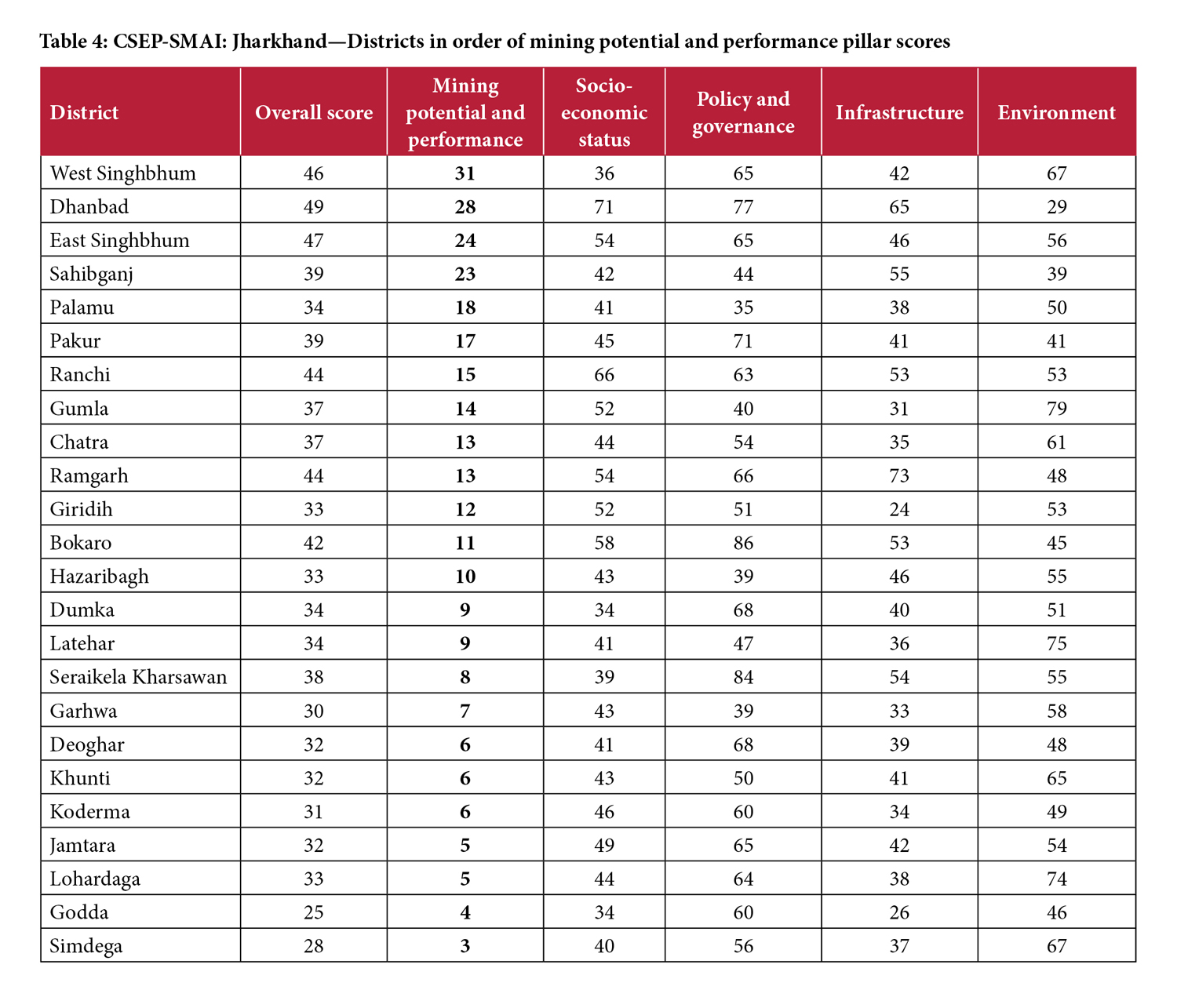 Jamtara (ranked 19 overall) is another interesting case as it gets an above-average ranking on all pillars barring mining potential and performance (21). Jamtara’s scores in the other pillars are not high enough to differentiate it from the remaining districts. Still, its score on the mining potential and performance pillar is much lower than other districts, which brings down its overall rank.