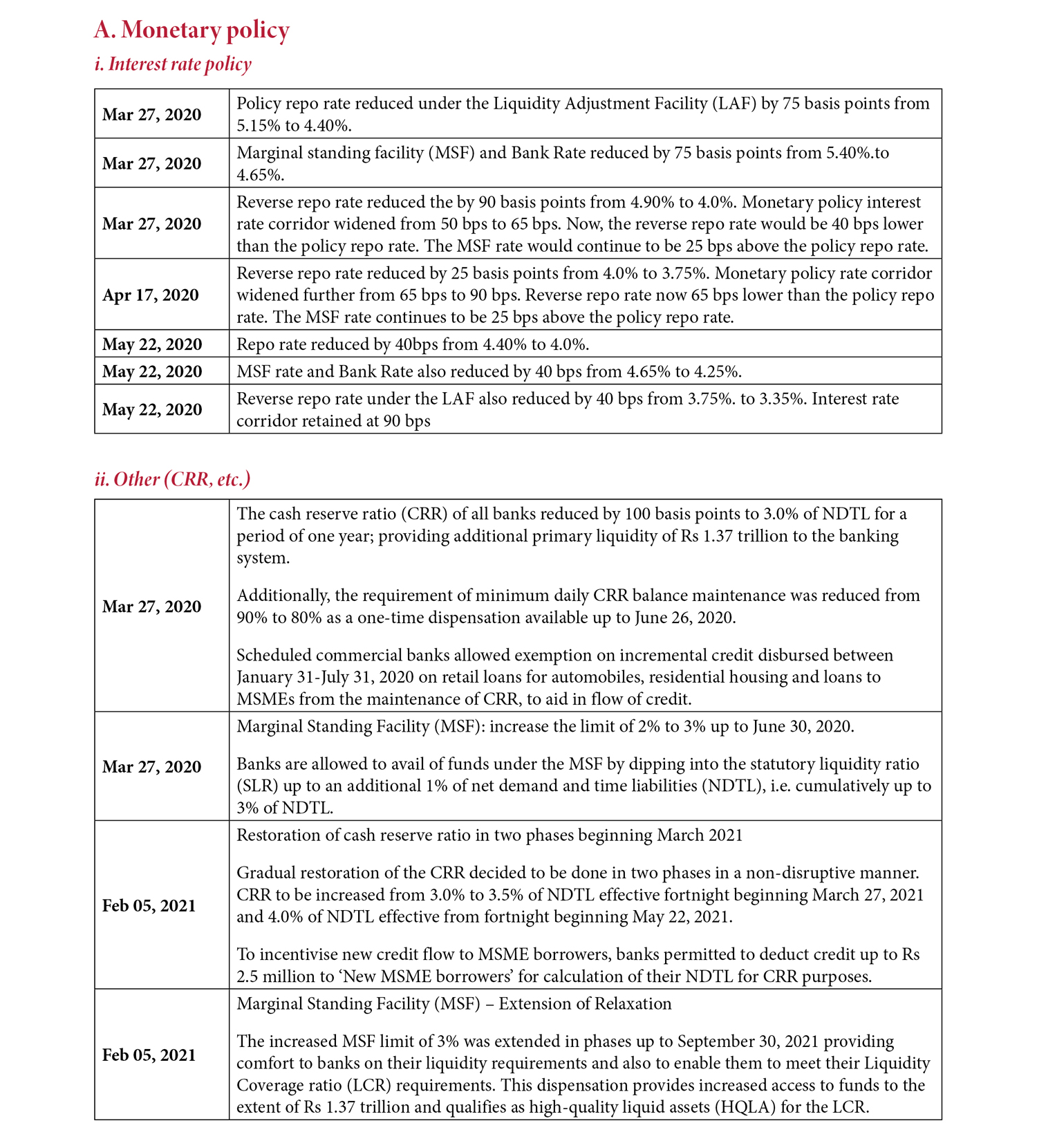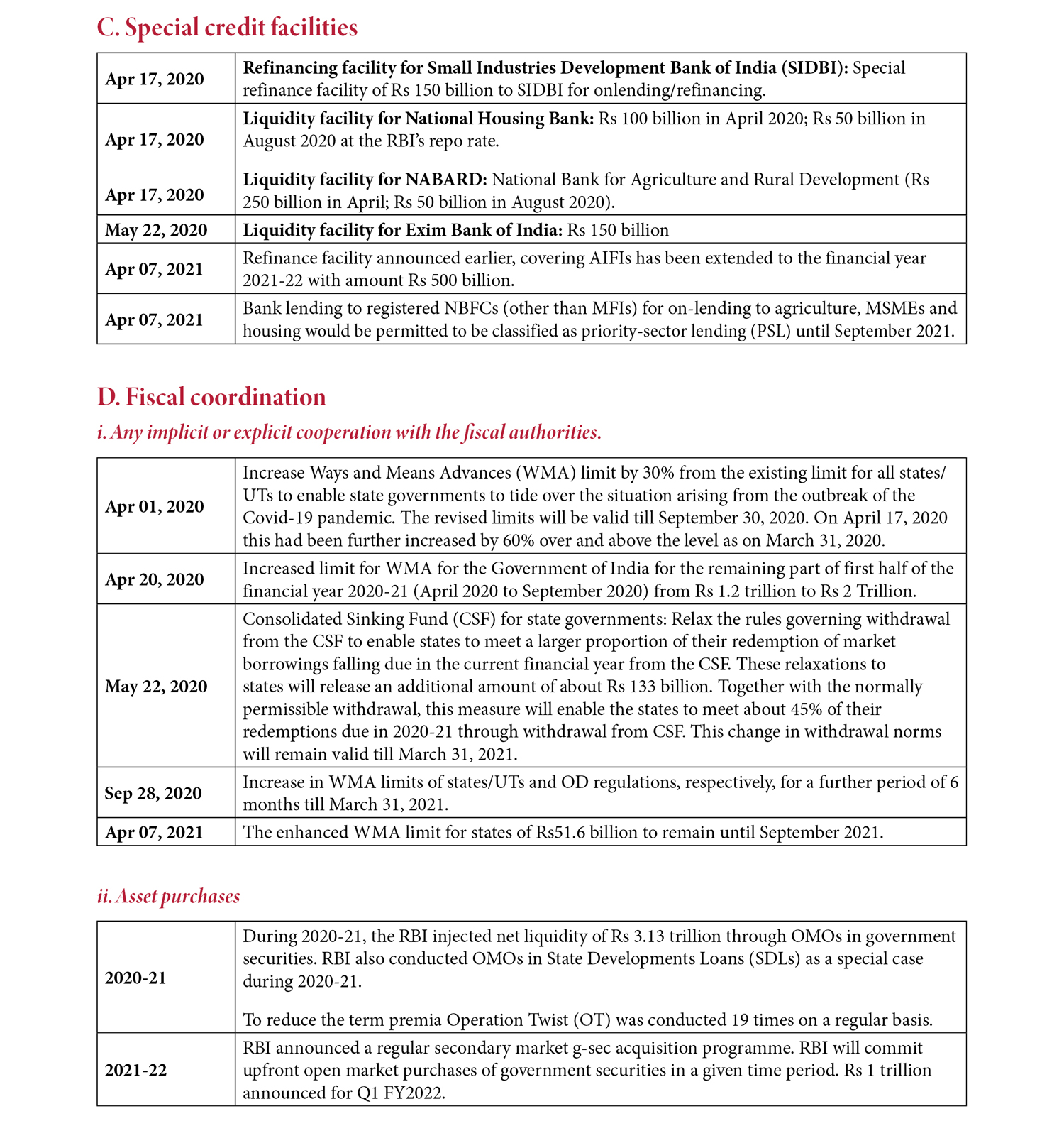 In accordance with these objectives, in cooperation with the government, the RBI implemented a plethora of policy changes throughout the year starting in March 2020. Some were at a general, macro level, while some others were at a micro level and detailed. An almost full chronology is provided in the table in the Annex. They can be grouped into four broad categories, though some were not easy to classify: