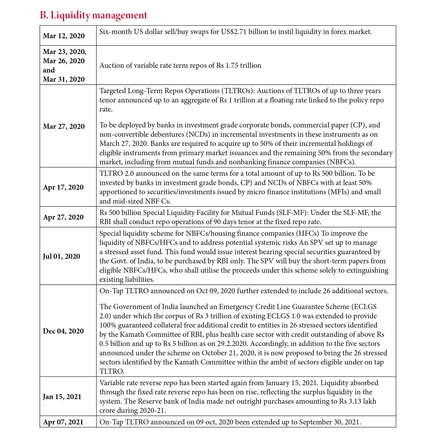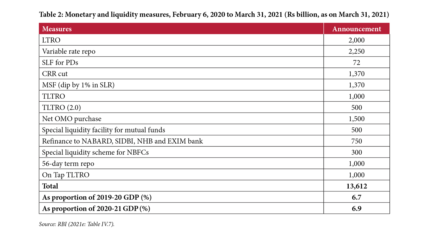 The overall objective therefore was to make sure that no part of the financial system faced any difficulty in accessing funds during this whole Covid period. The total potential liquidity injection amounted to Rs 13.6 trillion, about 6.9% of GDP, by March 31, 2021 (Table 2). The liquidity operations were a combination of market liquidity provisions supplemented by targeted ones in terms of both specified instruments and sectors.