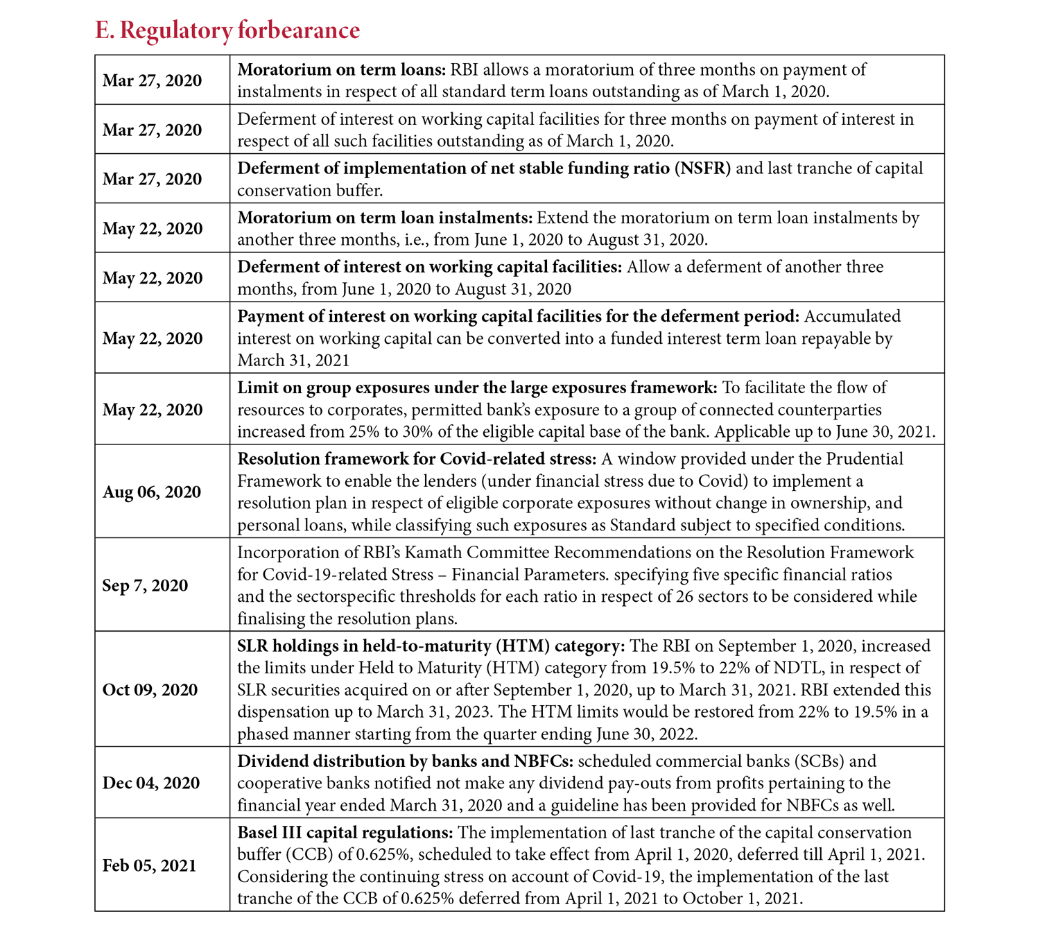 The implementation of the last tranche of 0.625% of the capital conservation buffer (CCB) was scheduled to take effect from April 2020. This was first deferred to April 2021, and then again to October 2021, in order to “aid in the recovery process” from Covid-induced stress (RBI 2021b).