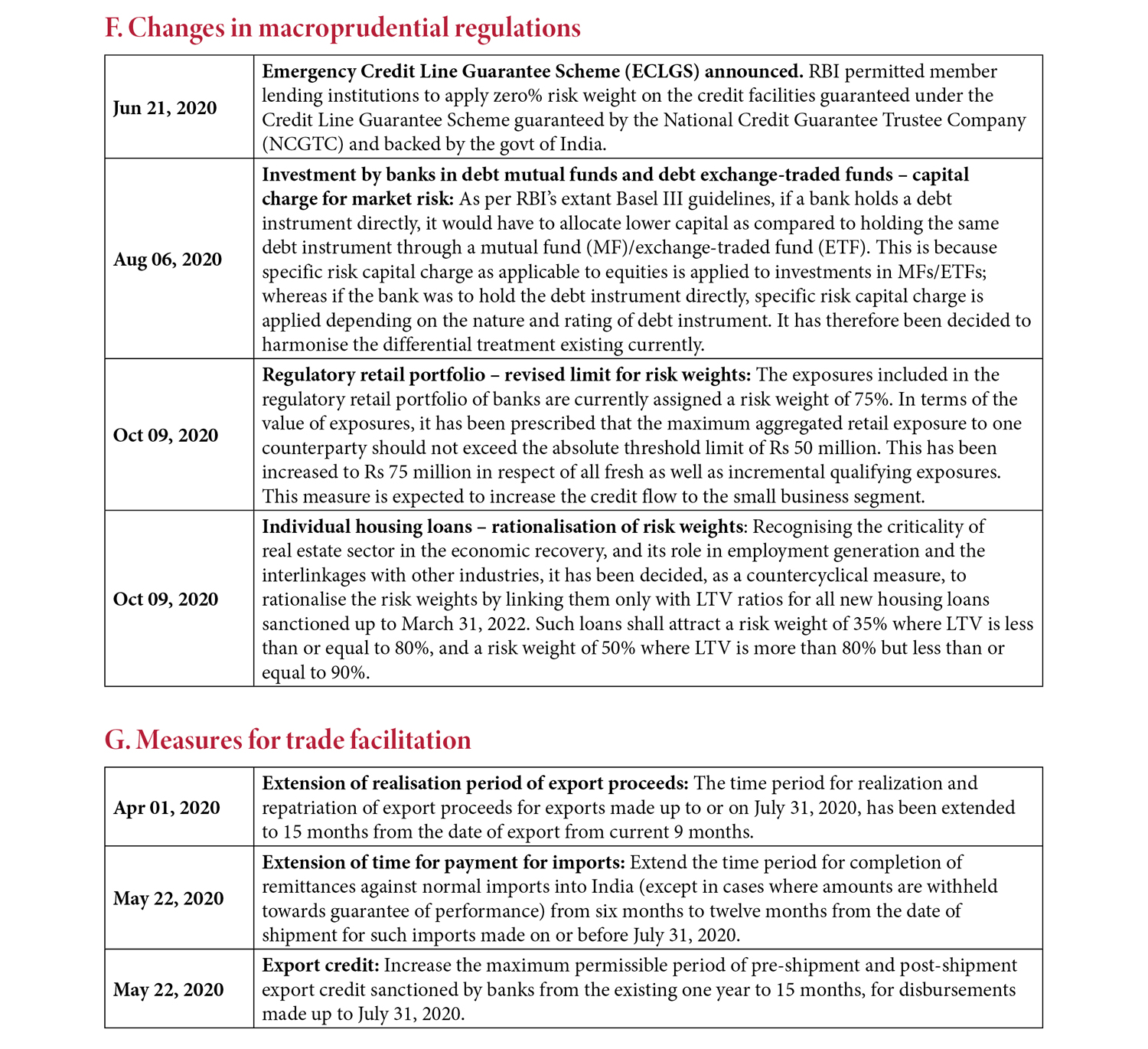In previous episodes of potential financial instability, macroprudential measures were used to curb housing finance through the counter-cyclical increase in risk weights applicable to certain categories of housing loans. In the current situation, however, retail investment in housing has suffered a downturn following lockdowns and other Covid- induced economic disruptions. The RBI has therefore tweaked risk weights to make them more favourable for certain categories of housing loans depending on specified loan-to-value (LTV) ratios, in order to ease bank lending for housing (RBI 2020f).