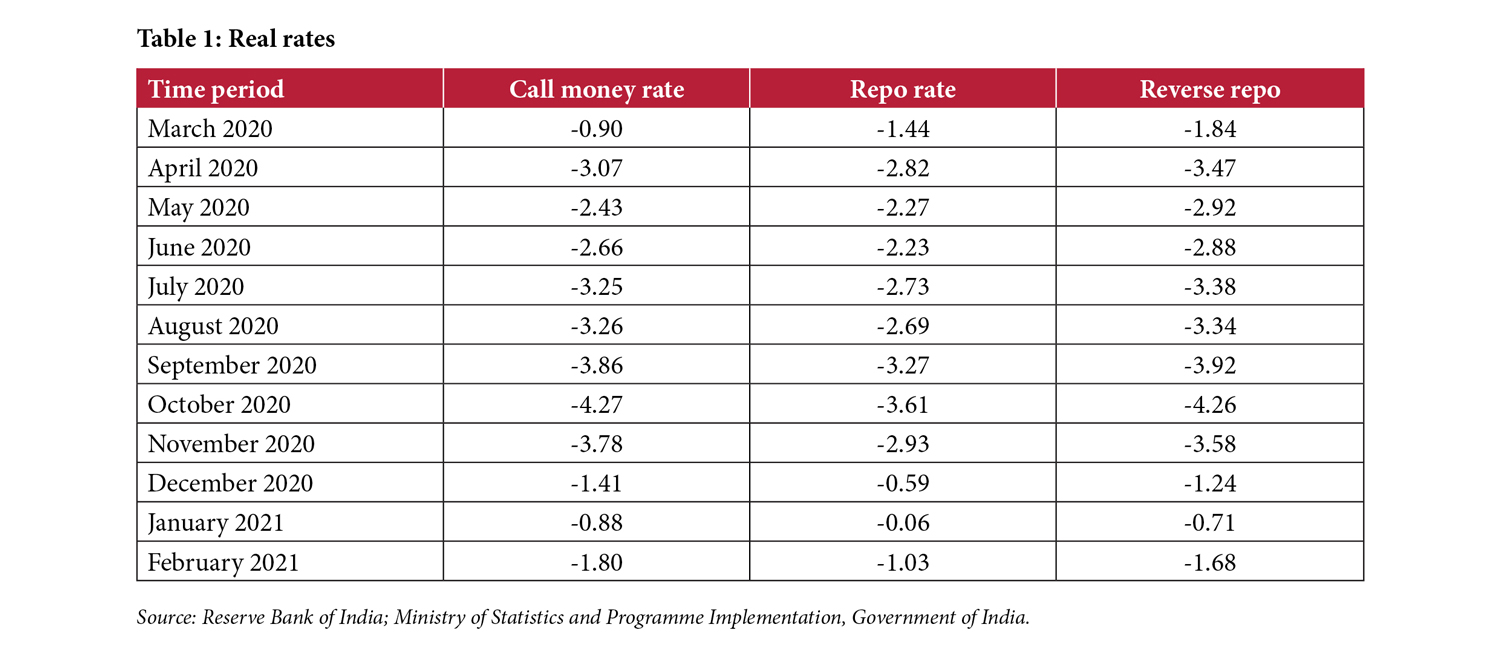 Although the RBI is some distance away from nominal negative rates, its real policy rates were in negative territory through much of 2020 and beyond because of elevated inflation levels. This has been transmitted to both bank deposit and lending rates, and the money market target rates (WACR) as well. The real yield on risk-free ten-year government securities were also negative through much of 2020. Thus, in view of the relatively higher inflation rates prevalent in India (and other EMEs), while the central bank has not had to resort to nominal negative policy rates, its highly accommodative monetary policy has indeed resulted in significant real negative rates (Figure 2 and Table 1).
