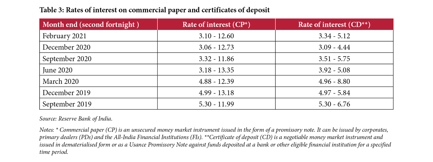 Corporate bond spreads also narrowed considerably across the maturity spectrum and rating categories and have reached pre-Covid levels. Moreover, in view of the lower rates, corporate bond issuance in the April to February period of FY 2021 exceeded that in the previous year’s comparable period by about 20%. The reduction in rates was across the board in all financial markets, including other instruments such as commercial paper (Table 3). This could give rise to financial stability issues if there is an increase in bond defaults consequent to lower-than-expected economic recovery.