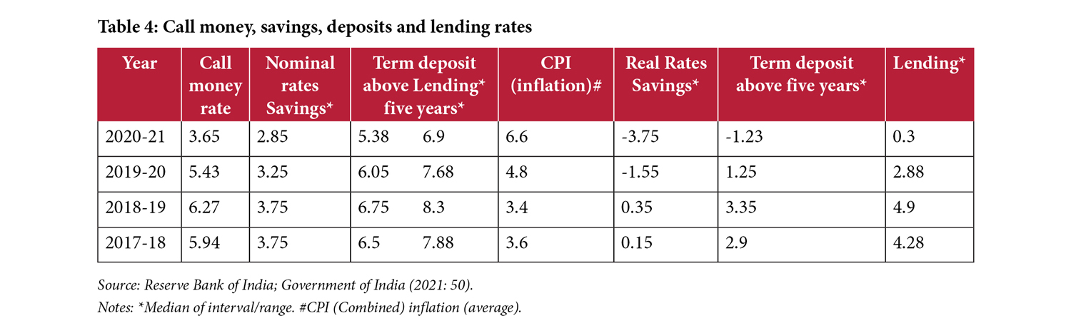 Transmission of the highly accommodative monetary policy, and the corresponding liquidity management, put in place right at the beginning of the Covid crisis has been largely successful. Interest rates have fallen across the board and g-sec yields are at almost record lows, as are private sector bond market and commercial paper yields and bank deposit and lending rates (Table 4). However, the RBI’s liquidity injection has been so large that there has been an almost consistent systemic liquidity surplus of about Rs 6 trillion (about 3% of GDP) that needs to be absorbed on a daily basis. This liquidity injection is a consequence of the RBI’s aggregate domestic asset purchases of around Rs 3 trillion and forex interventions amounting to over Rs 5 trillion over FY 2021. Therefore, the target money market interest rate (WACR) has been somewhat below the reverse repo rate.