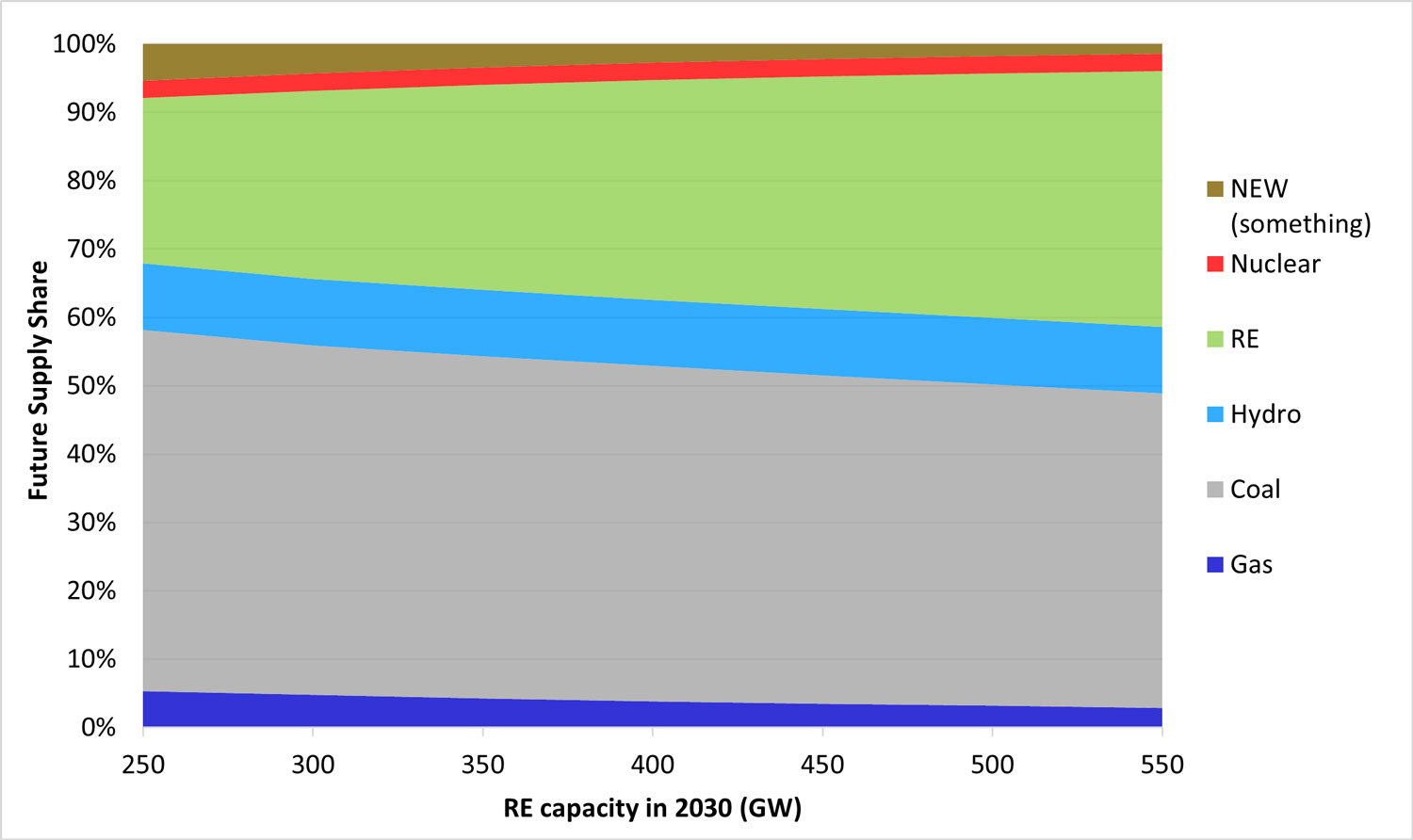 Figure 1: 2030 optimal supply mix based on varying shares of RE in 2030 (before adding something NEW, which might further displace generation from existing gas or coal).