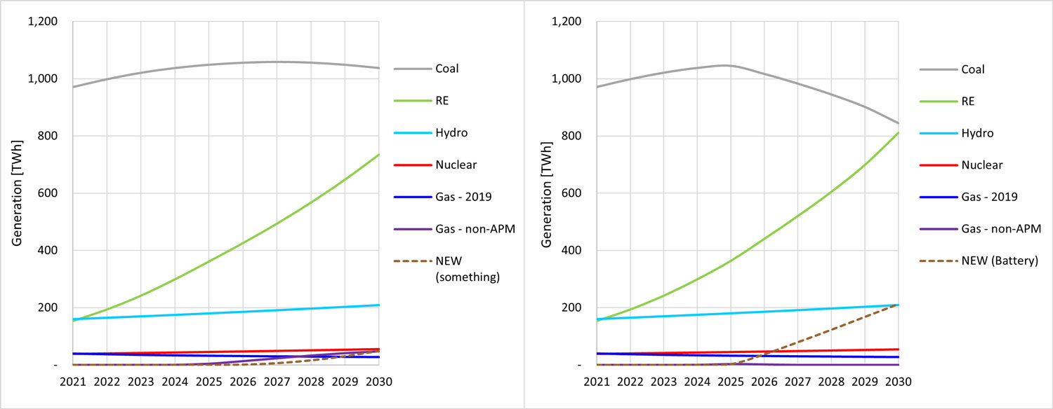 • Even with very high RE and minimal coal fleet retirement, modest demand growth for electricity of 5.25% annually means there is insufficient supply at many time periods from the existing capacity plus RE, and so “something new” is required;