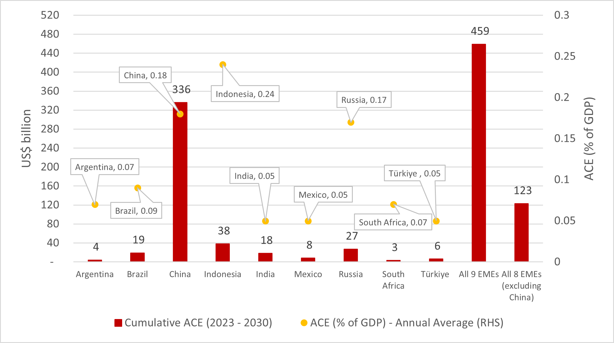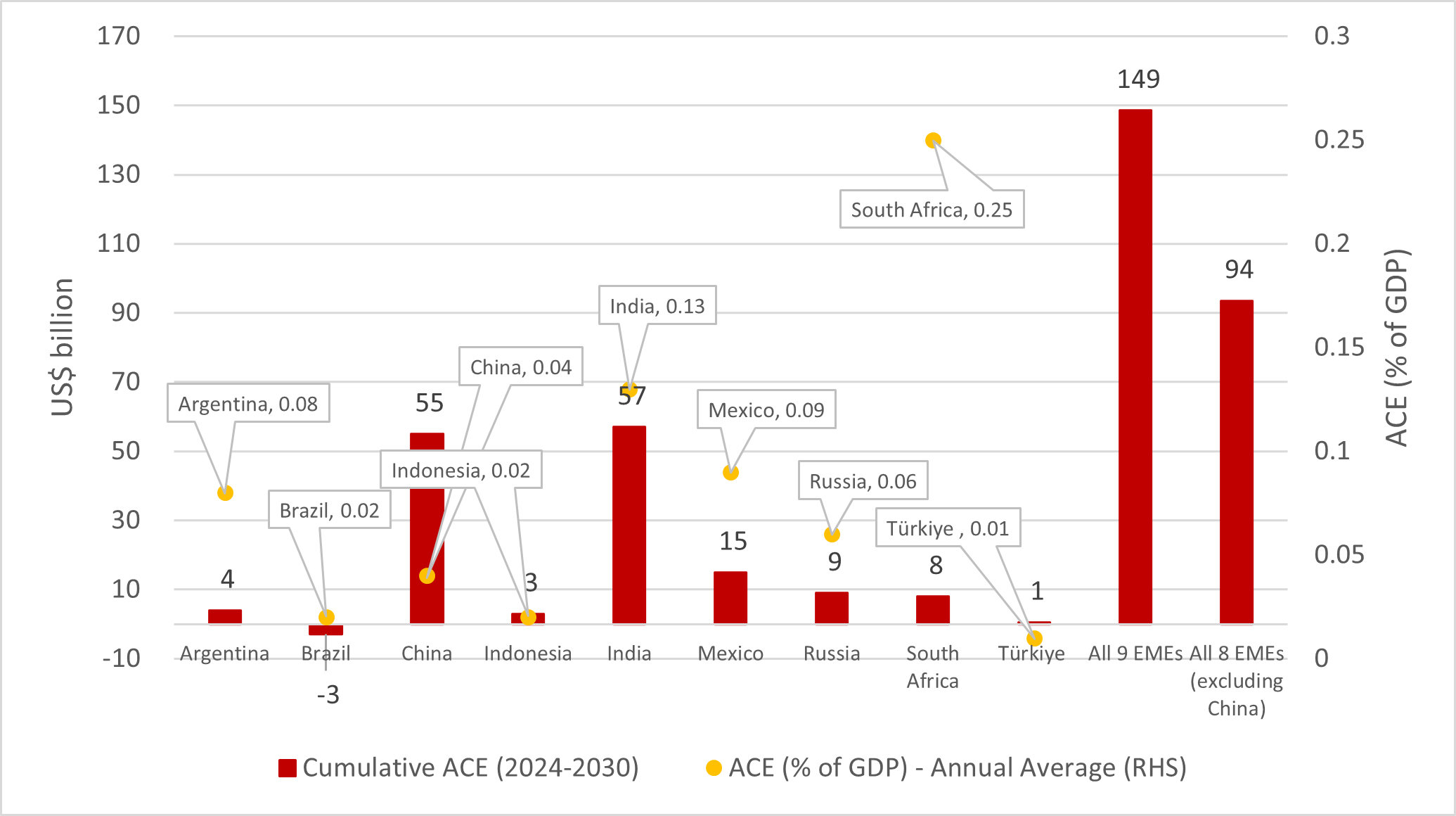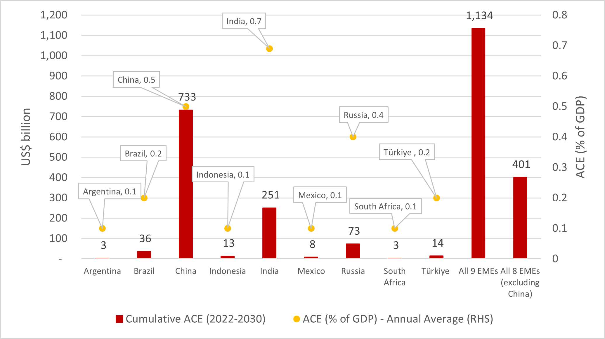 Excluding China, it is estimated that the other eight other economies would require capex of $71 billion for power generation for 2024-2030. However, with the addition of storage costs, cumulative climate finance for the eight economies is estimated at $94 billion which works out to  $13 billion annually (Figure 1).