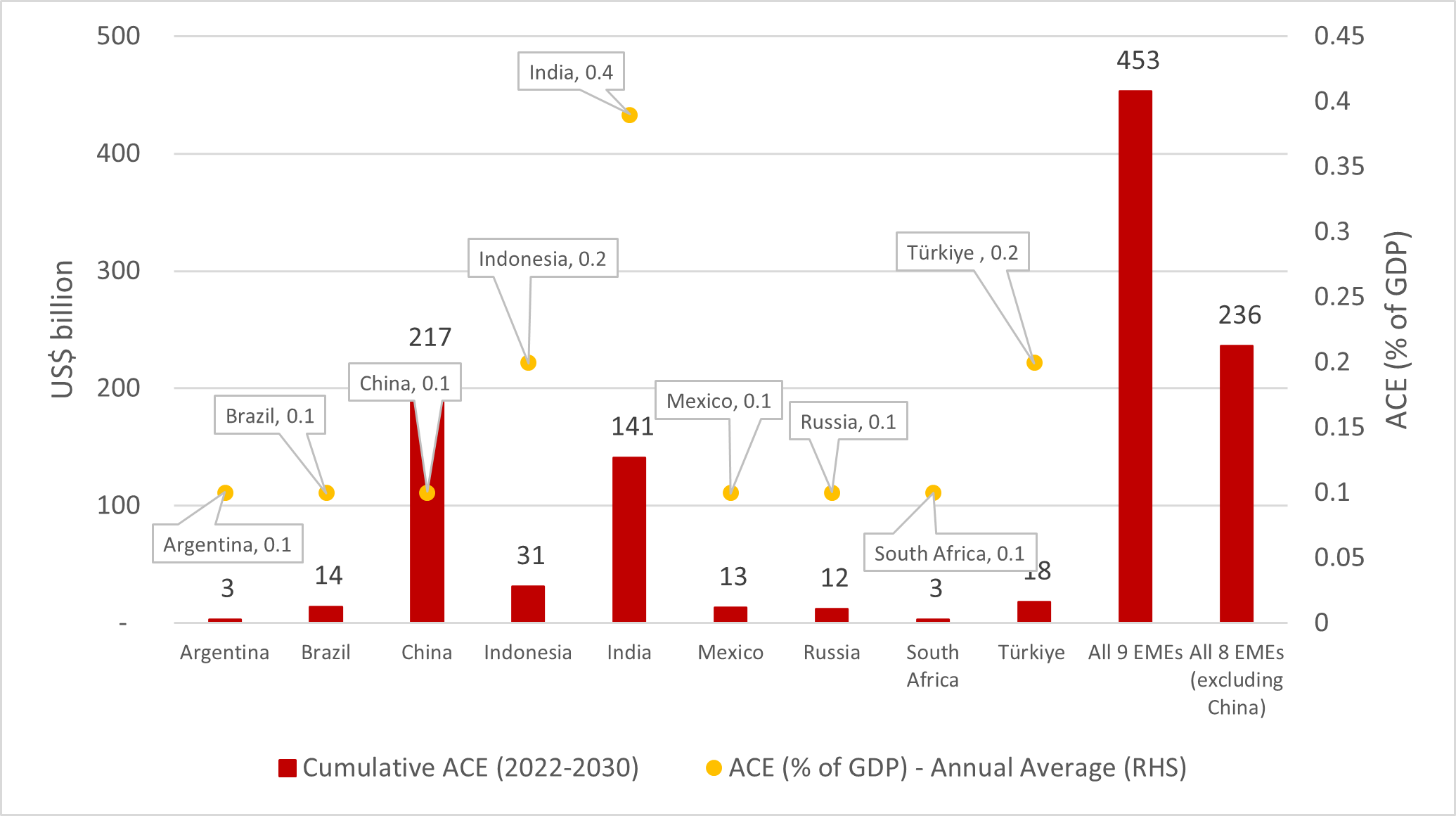 Our study An Assessment of Climate Finance – Nine G20 Emerging Economies’[1] examines the climate finance requirements of nine EMEs (Argentina, Brazil, China, India, Indonesia, Mexico, the Russian Federation, South Africa, and Türkiye) from 2022 to 2030[2].  All the EMEs selected are a part of the G20 and they together account for 30 per cent of global gross domestic product (GDP), 47 per cent of global population and 30 per cent of global carbon emissions. The study covers the four highest carbon emitting sectors – power, road transport, cement, and steel – which cumulatively constitute 40 per cent of carbon emissions in the nine EMEs selected for the study.