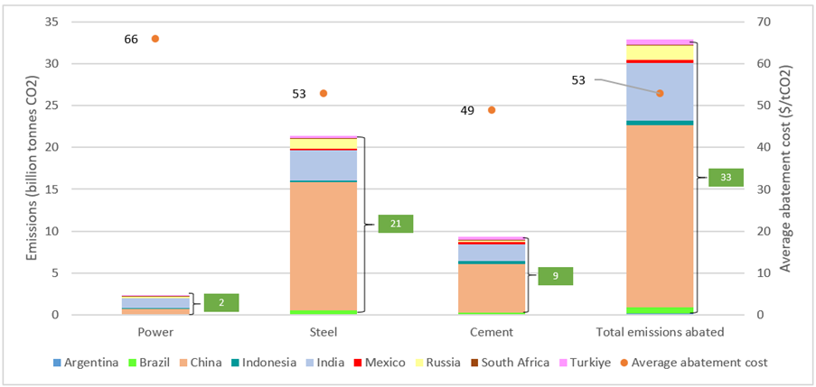 The average cost to mitigate one tonne of CO2 is estimated at $53 across the three sectors. On a per unit basis, the power sector is estimated to be the most expensive to decarbonise, the average cost of which works out to $66 per tCO2, followed by steel at $53 per tCO2 and cement at $49 per tCO2 (Figure 5).
