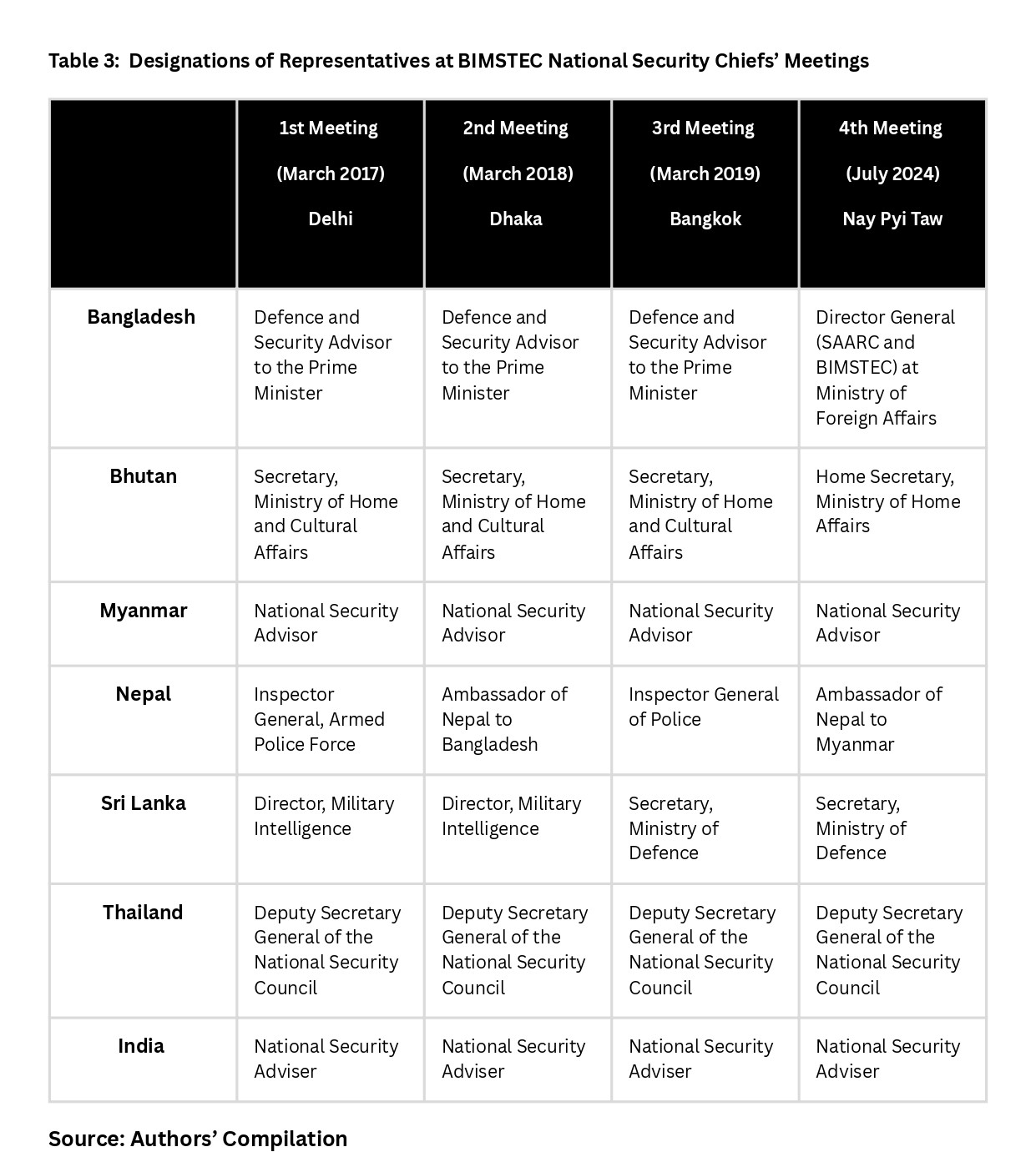 Finally, BIMSTEC will also have to harmonise different perceptions of security among its member states. This gap is indicated by the wide range of different representatives at the NSC (see Table 3). The participants at the four meetings held so far include a mix of civilian, military, intelligence, and police representatives.