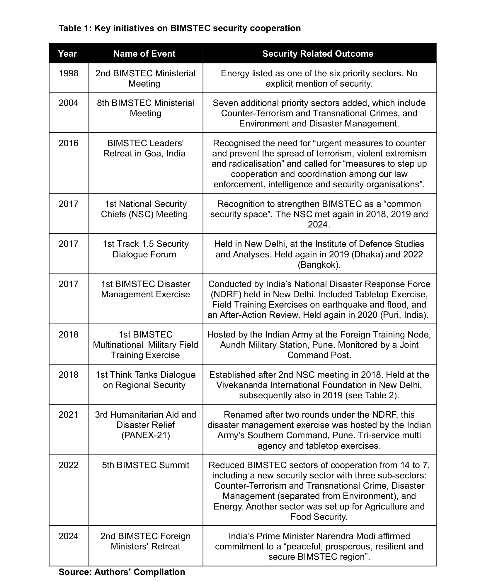 Table 1: Key initiatives on BIMSTEC security cooperation
