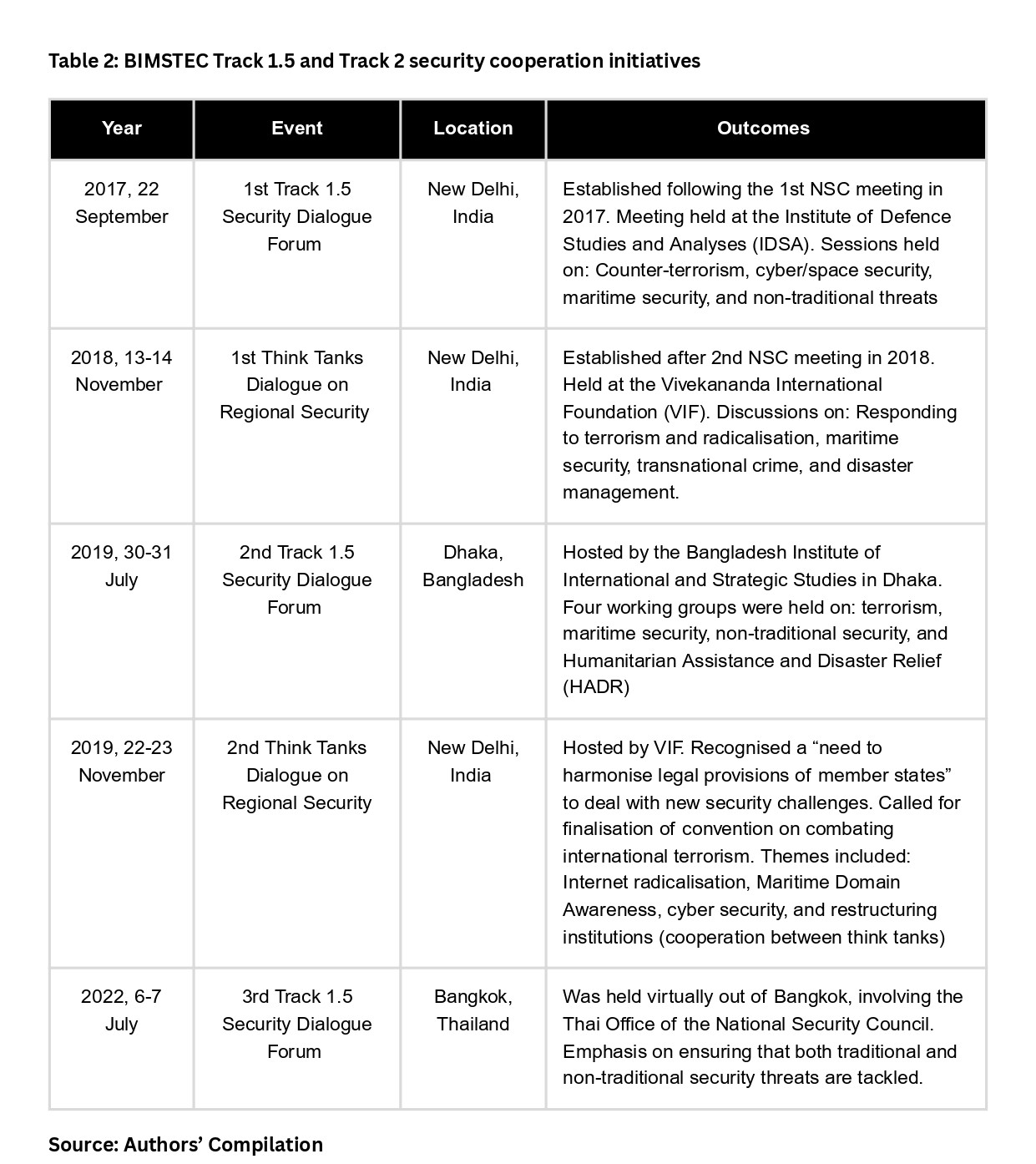 Finally, the securitisation of BIMSTEC also found expression in more regular engagements beyond the official, governmental or military tracks. Starting in 2017, BIMSTEC hosted or supported a variety of track 1.5 and track 2 policy dialogues that involved think tanks and experts from across the Bay of Bengal region. These platforms emerged as an important auxiliary site for informal exchange of perspectives on the regional security environment. Among the most frequent topics were counter-terrorism, cyber and maritime security (see Table 2).
