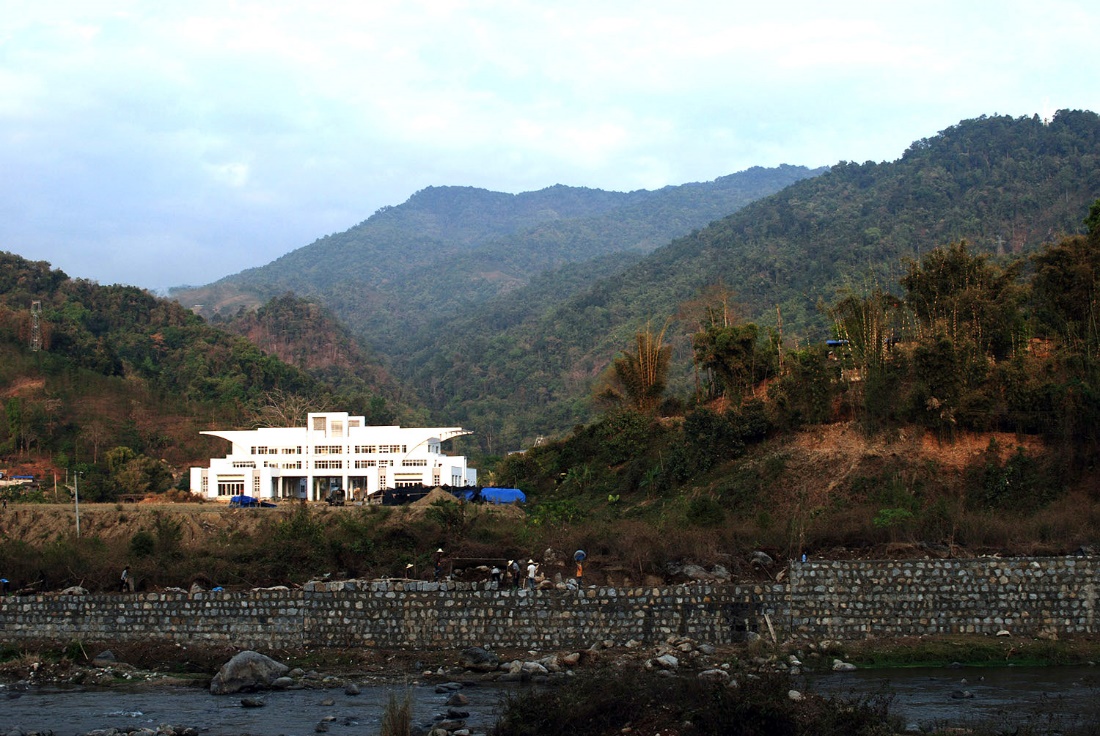 Caption: The Chinese border photographed from KIO-controlled territory in 2014: A newly-built Chinese toll station lays abandoned while Chinese workers fortify the border wall after a 17-years long ceasefire between the KIO and the Myanmar military broke down. Source: David Brenner.