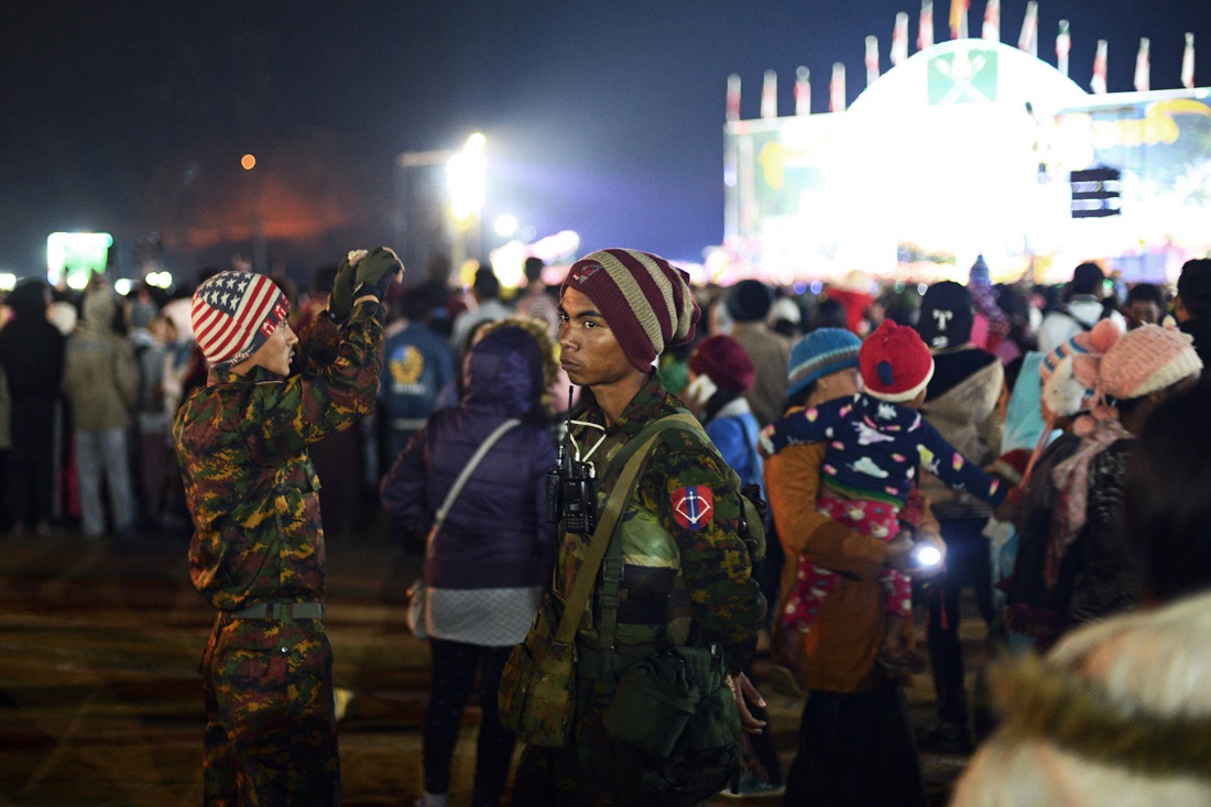 Caption: Myanmar army (Tatmadaw) soldiers show a heavy presence at the Naga New Year’s Celebrations in Nanyun, in the Naga Self-Administered Zone of the Sagaing Region on the border of Myanmar to India, in January 2018. Source: David Brenner.