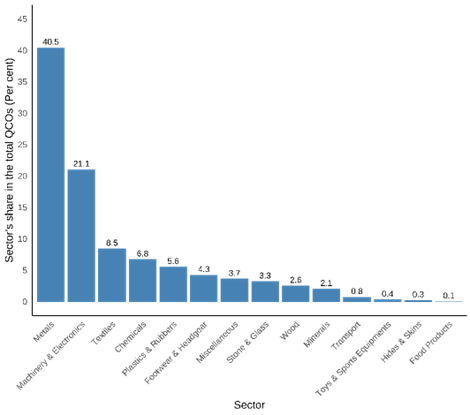 A sectoral analysis of QCOs shows that metals, machinery and electronics, textiles, chemicals, plastics and rubber, and footwear are among the most affected industries