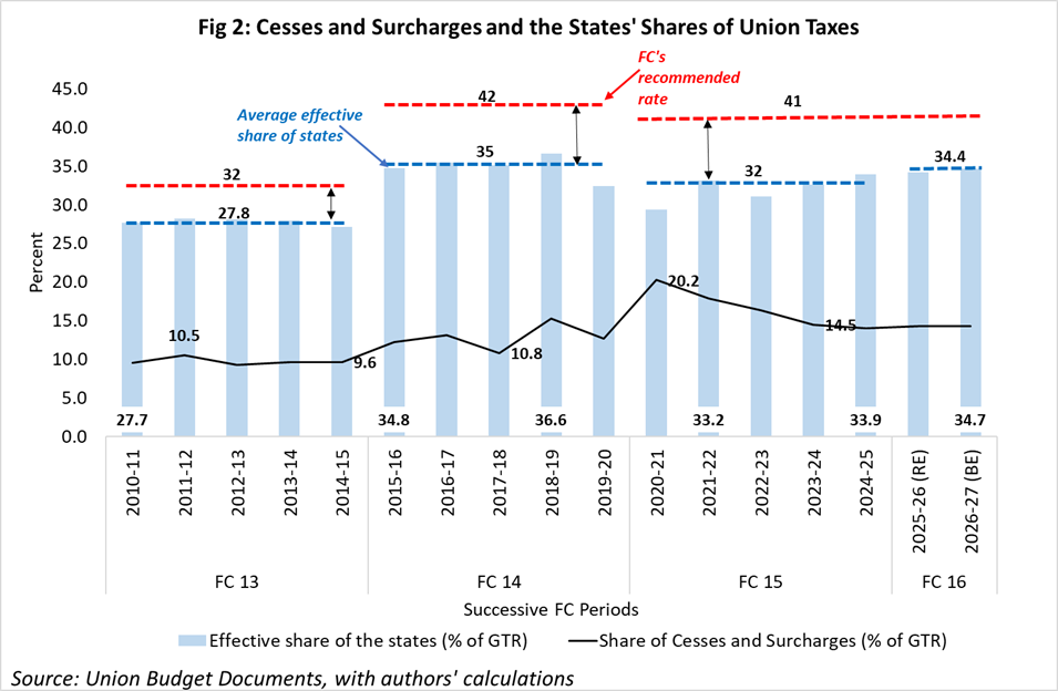 The key reason lies in the growing use of cesses and surcharges, which are special levies that, under the constitutional framework (Articles 270 and 271), are not shared with the states. They are deducted from GTR before the divisible pool is calculated, along with other deductions, such as the cost of collection and taxes accruing to union territories.