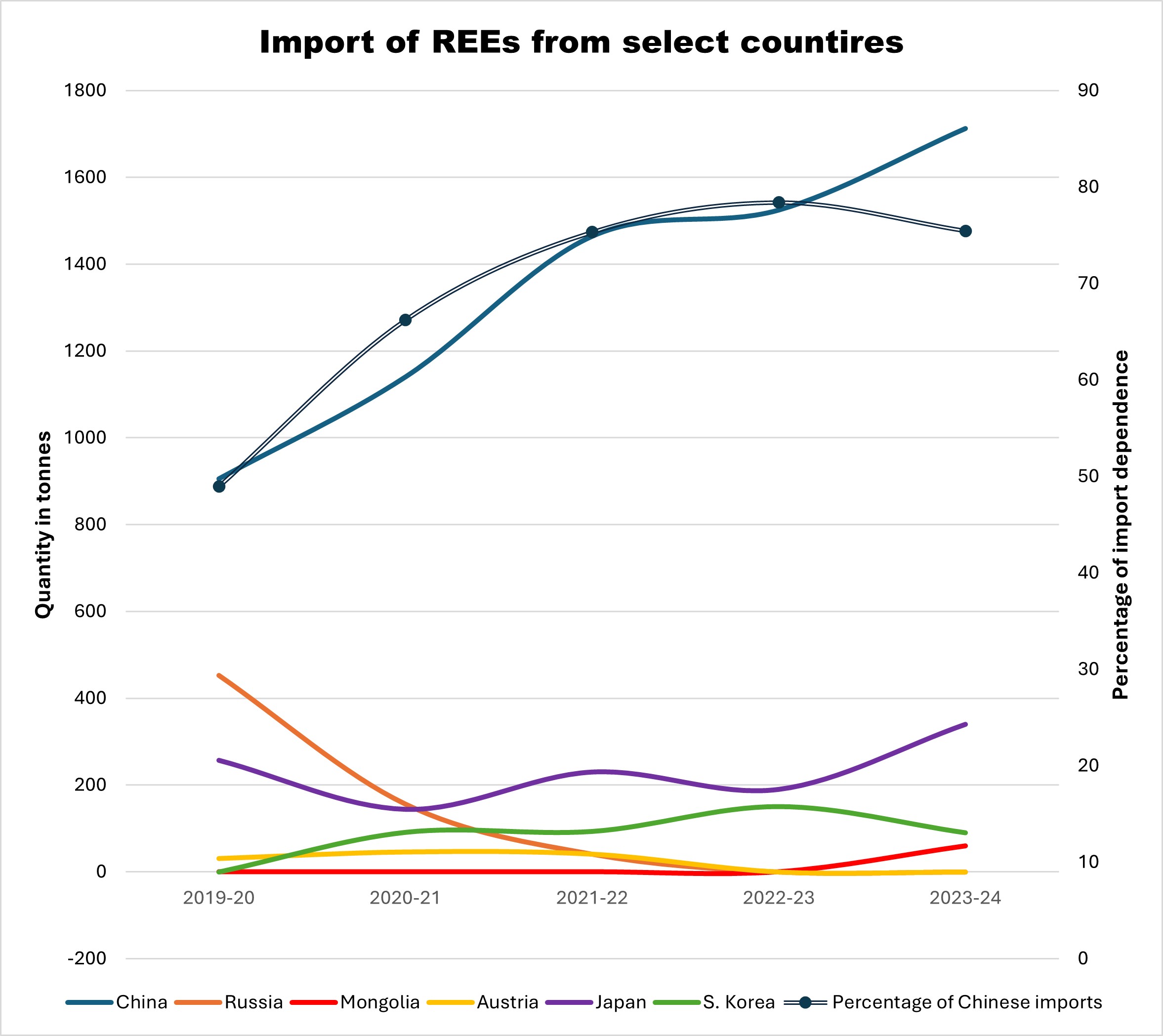 According to the Ministry of Mines India currently remains completely dependent on 10 critical minerals[1]. Particularly, India is making efforts to diversify and reduce dependence on China, which contributes to 80% of the country’s rare earth elements (REE)[2] needs (See Figure 1). There has been a small decline in the share of imports from China due to an increase of imports from Japan and Mongolia, but volumes imported from China have been steadily rising (Figure 1).
