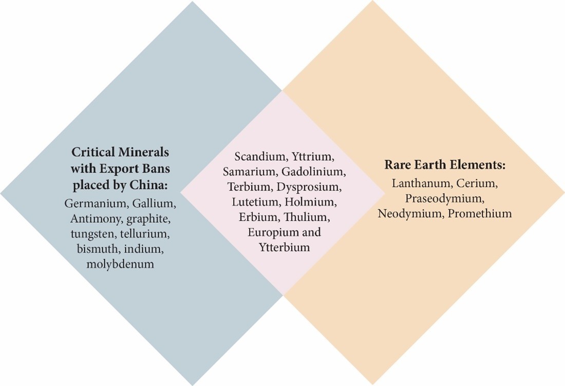 Figure 2: List of critical minerals on which China has or had placed export bans between July 2023 and November 2025 (Blue), and List of REEs (Pink). Note the overlap between REEs and critical minerals with export bans placed on them.