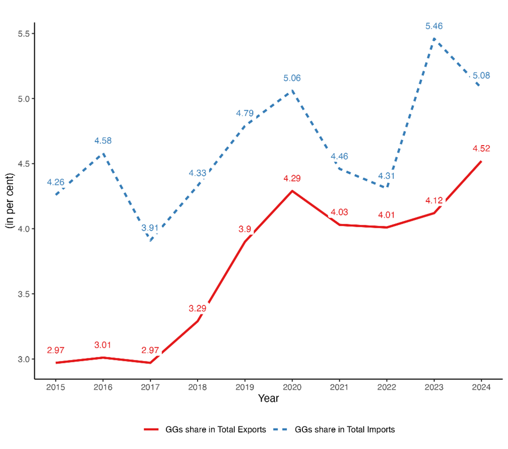 Figure 1 presents India’s exports and imports of GGs as a share of its total exports and imports over the past decade. In 2024, GGs accounted for 4.5% of India’s total exports growing at a compound annual growth rate (CAGR) of 9% over the past decade, more than double the 4.4% CAGR of non-GG exports. On the import side, GGs constituted 5% of total imports in 2024, with a decade-long CAGR of 7.8%, compared to 5.8% for other goods. While the volume of GG imports has consistently exceeded exports (Figure 2) over the decade, the higher growth rate of GG exports signals a promising trend. In 2024, India imported 42% of the total GG goods from China, followed by the United States (6%) and Germany (5%).