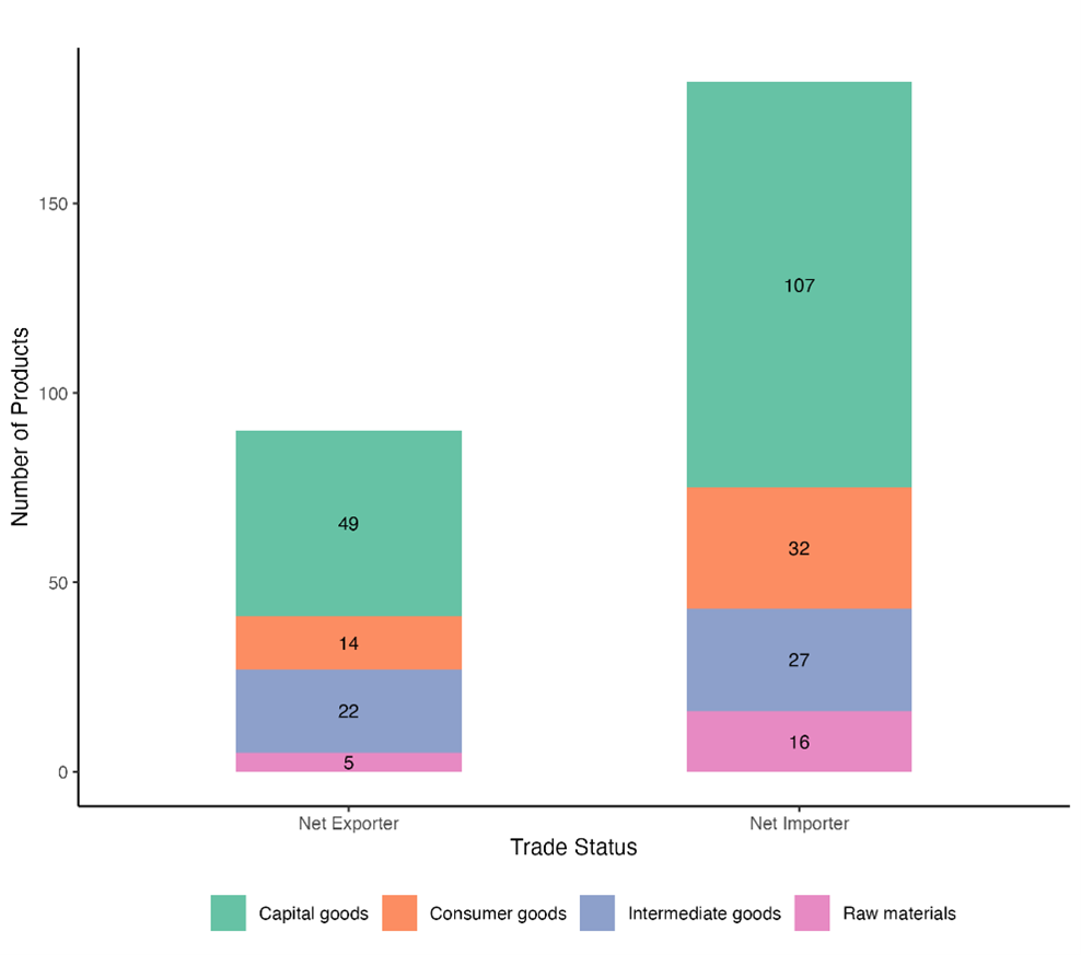 India exhibits relative export strength in Intermediate goods, being a net exporter in nearly half (45%) of them (22 out of 49). However, it remains significantly import-dependent in other categories, particularly raw materials and capital goods category wherein India is a net importer in around 76% and 68% of products respectively (Figure 3). This suggests that while India is building capacity in Intermediate goods, it still relies heavily on imports of key capital-intensive green technologies which are important for supply chain integration, and high value addition.