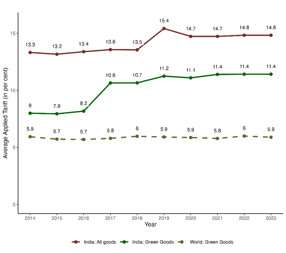 Figure 5: Average effectively applied tariff on Green Goods: Global vs. India (2014–2023) (in %)