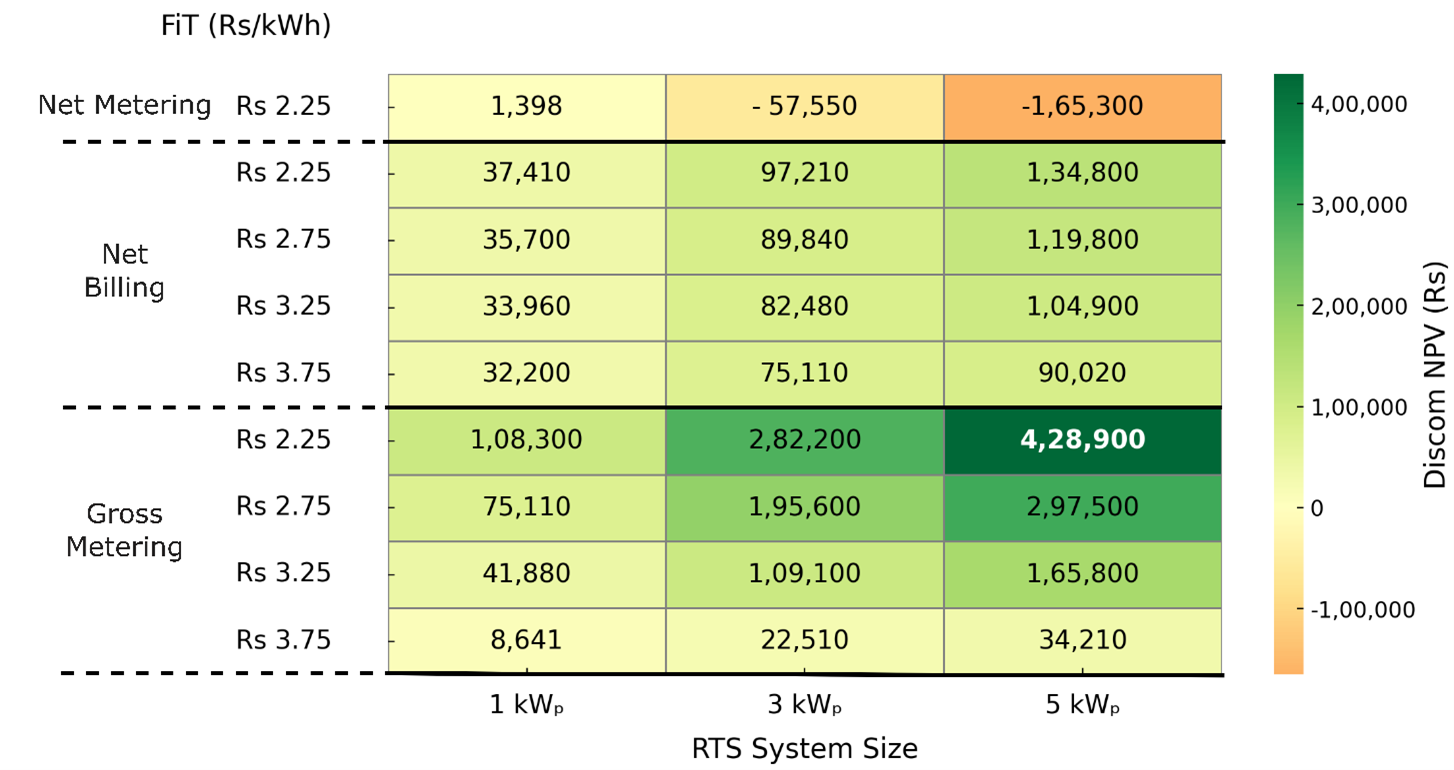 2. Lower FiTs boost Discom income under both gross metering and net billing, reinforcing the inverse relationship between FiT level and utility revenue in these two models.