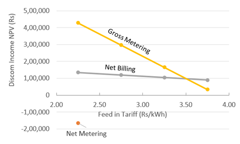 Figure 2 compares Discom revenue for a 5 kWp rooftop system under the three metering regimes across a range of feed-in tariffs (FiTs). Two patterns stand out: