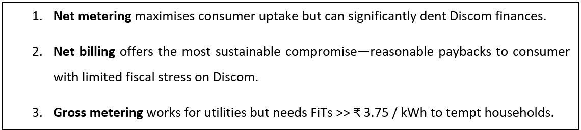 3. Gross Metering – Every unit generated is sent to (and paid for by) the grid at a regulated FiT; the household buys all its power at normal tariffs. This clean separation shields Discom finances, but offers the weakest economics for consumers unless the feed-in tariff is set attractively high.
