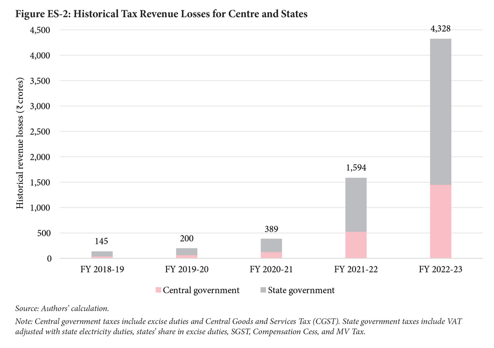 This paper examines the impact of EV uptake on three tax streams: Excise and Value Added Tax (VAT) losses from fuel switch to electricity (which is a well-known issue), revenue forgone from concessional Goods and Services Tax (GST) rates and Compensation Cess exemptions; and state losses from Motor Vehicle (MV) tax exemptions. The study focuses on India’s passenger car and two-wheeled vehicle segments to illustrate how impacts on government revenue collection vary with vehicle segment, owing to differences in vehicle price, fuel mix, tax rate, and the scale and rate of EV penetration.