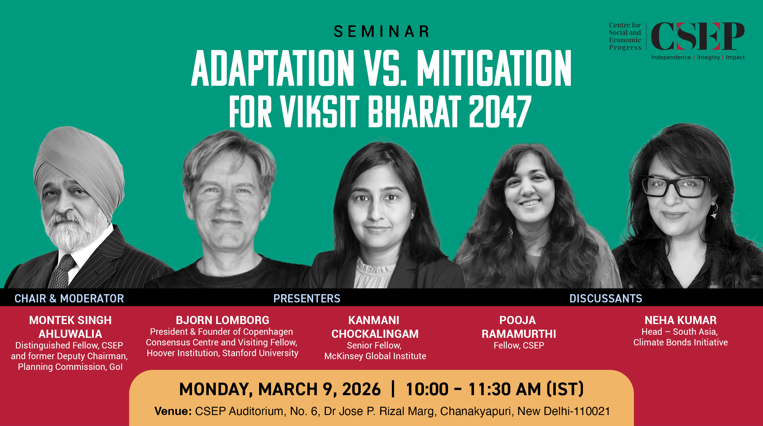 The Centre for Social and Economic Progress (CSEP) is delighted to invite you to a seminar titled “Adaptation vs. Mitigation for Viksit Bharat 2047” on Monday, March 9, 2026, from 10:00 to 11:30 am (IST) at the CSEP Auditorium, 6, Dr Jose P Rizal Marg, Chanakyapuri, New Delhi – 110021.