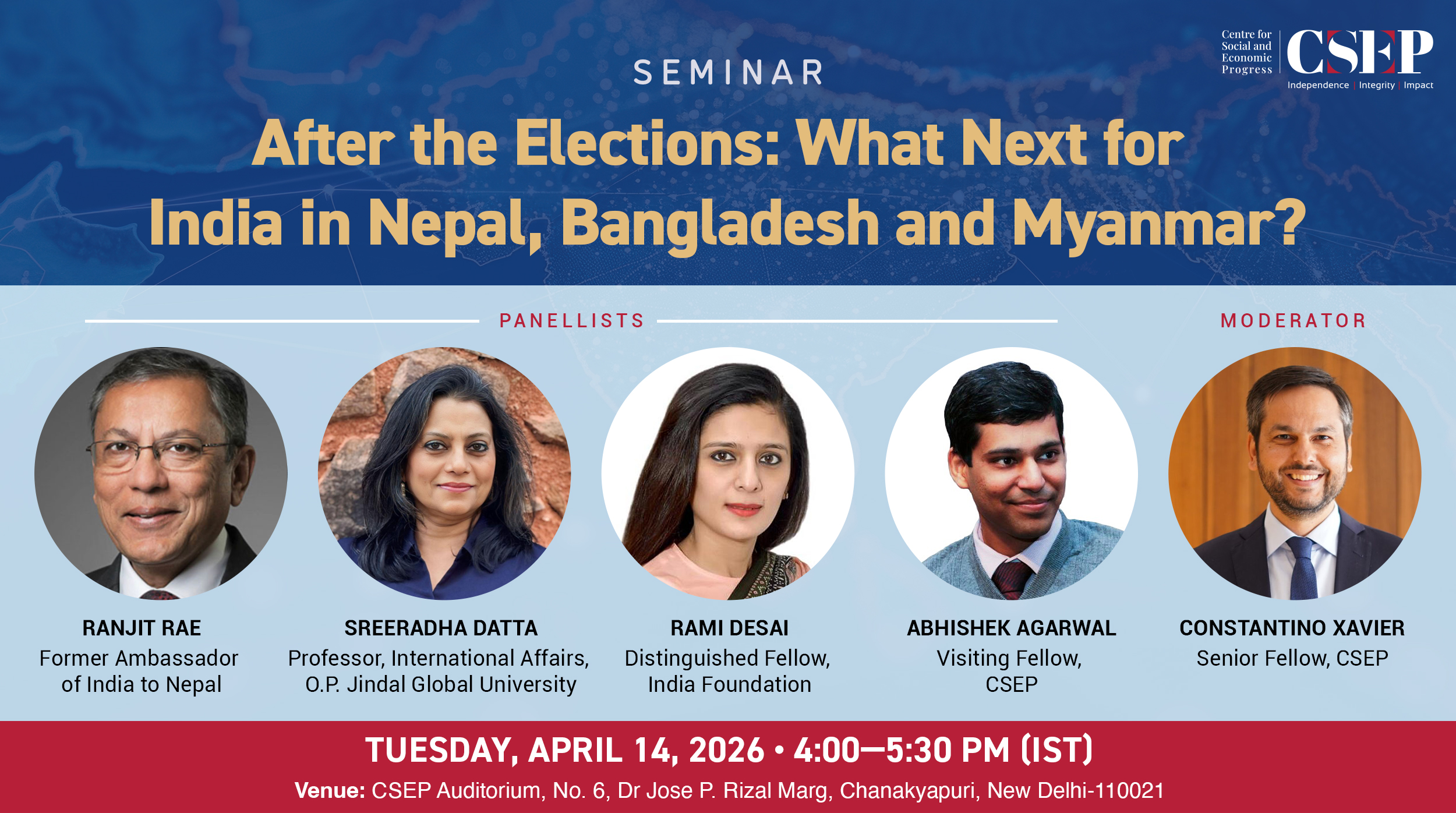 The Centre for Social and Economic Progress (CSEP) is delighted to invite you to a seminar titled “After the Elections: What Next for India in Nepal, Bangladesh and Myanmar?” on Tuesday, April 14, 2026, from 4:00 to 5:30 pm (IST) at the CSEP Auditorium, 6, Dr Jose P Rizal Marg, Chanakyapuri, New Delhi – 110021.