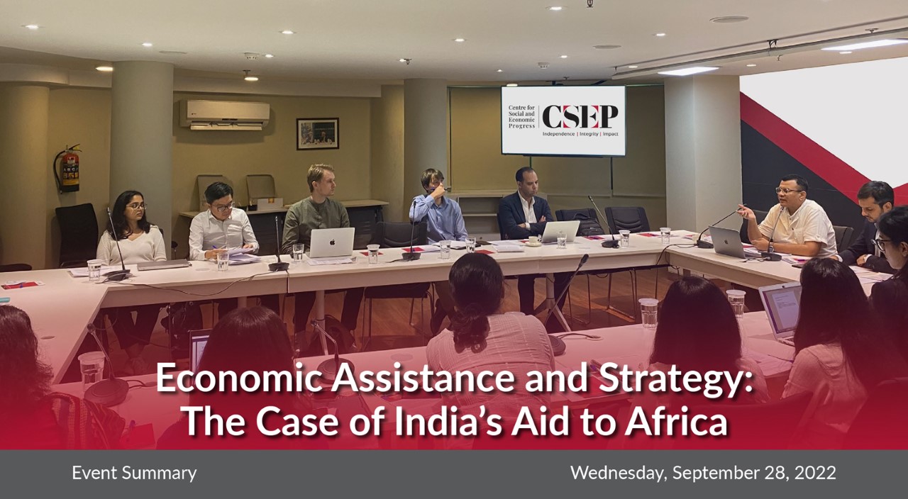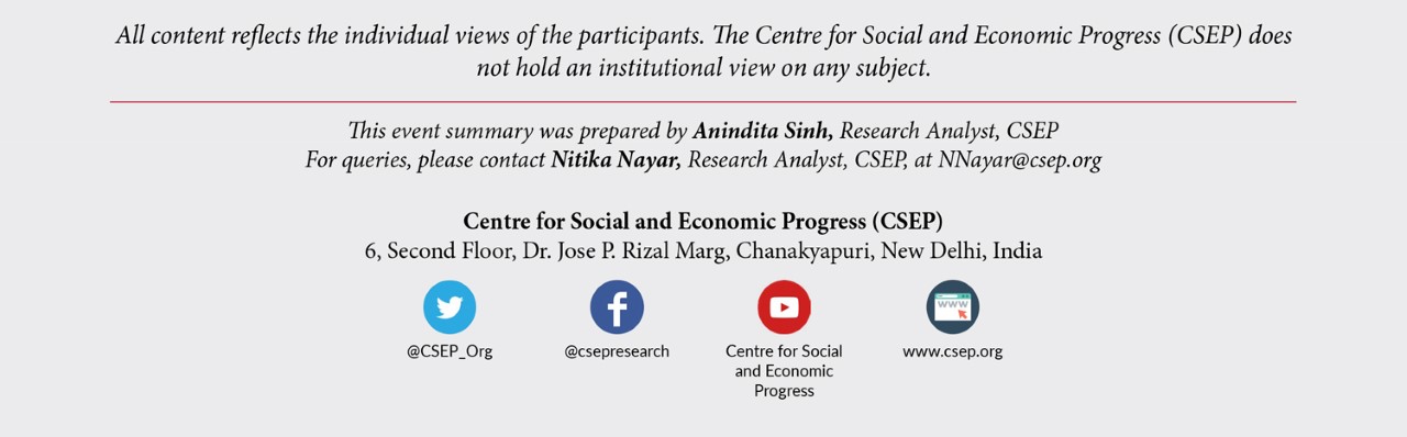 • The Centre for Social and Economic Progress (CSEP) hosted the tenth edition of its Foreign Policy and Security Tiffin Talk series with Chirayu Thakkar, Doctoral Candidate, National University of Singapore and King’s College London, on his research on Economic Assistance and Strategy: The Case of India’s Aid to Africa.