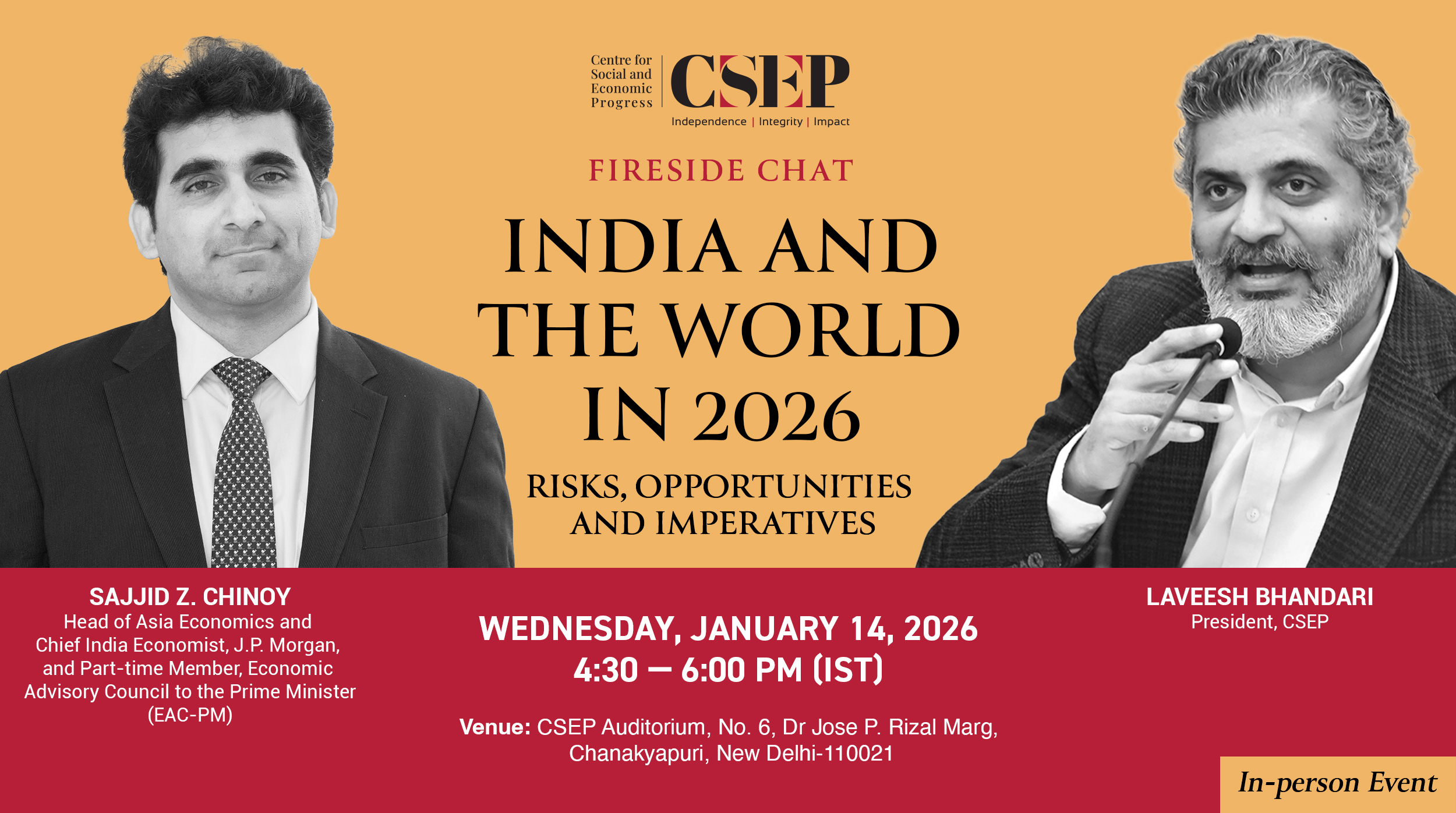 The Centre for Social and Economic Progress (CSEP) is delighted to invite you to a Fireside Chat titled “India and the World in 2026: Risks, Opportunities and Imperatives” on Wednesday, January 14, 2026, from 4:30 to 6:00 pm (IST) at the CSEP Auditorium, 6, Dr Jose P Rizal Marg, Chanakyapuri, New Delhi – 110021.