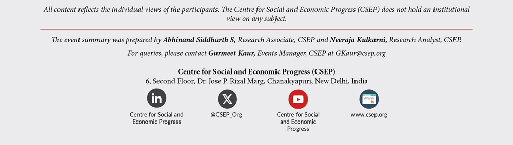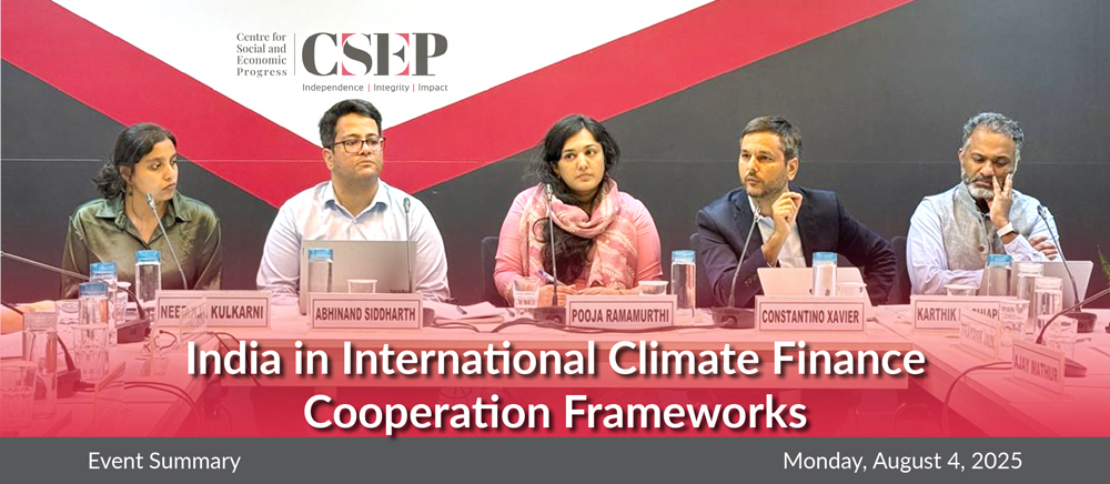 • On 4 August 2025, the Centre for Social and Economic Progress (CSEP) hosted a roundtable on “India in International Climate Finance Cooperation Frameworks” as a part of the Global Climate Cooperation Programme of the Foreign Policy and Security Series vertical.