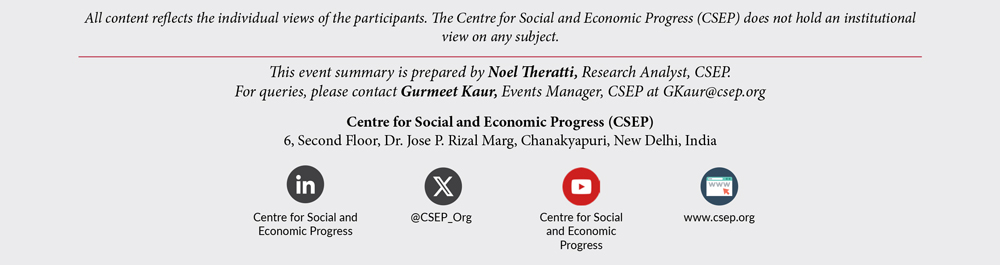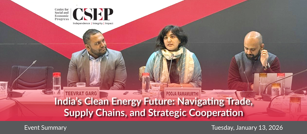 - The Centre for Social and Economic Progress (CSEP) and the University of California, San Diego (UCSD) hosted a half day convening on India’s Clean Energy Future: Navigating Trade, Supply Chains, and Strategic Cooperation. The convening built on the work at UCSD on the Agenda on Renewable Energy Trade between India and China (ARETIC) initiative’s research on India–China clean energy trade and CSEP’s analysis of strategies for India’s and China’s climate diplomacy.