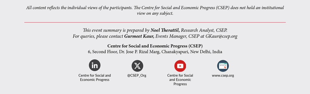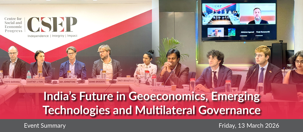 - The Centre for Social and Economic Progress hosted the 39th edition of its Foreign Policy and Security Tiffin Talk series on “India’s Future in Geoeconomics, Emerging Technologies and Multilateral Governance” in partnership with Ashoka University’s International Relations department.