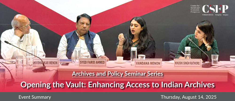 - On August 14, 2025, the Centre for Social and Economic Progress (CSEP), in partnership with King’s College London, NYU Abu Dhabi, and the New International Histories of South Asia (NIHSA) network, hosted the inaugural session of its Archives and Policy Seminar Series titled “Opening the Vault: Enhancing Access to Indian Archives.”