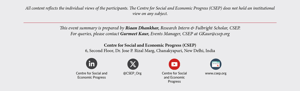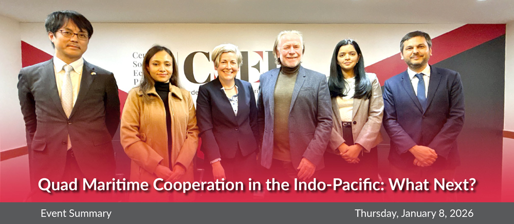 • The Centre for Social and Economic Progress hosted an in-person seminar featuring a presentation by Riya Sinha, Former Associate Fellow, CSEP, to launch her paper “India and the Quad in Port Development in the Bay of Bengal Region.”