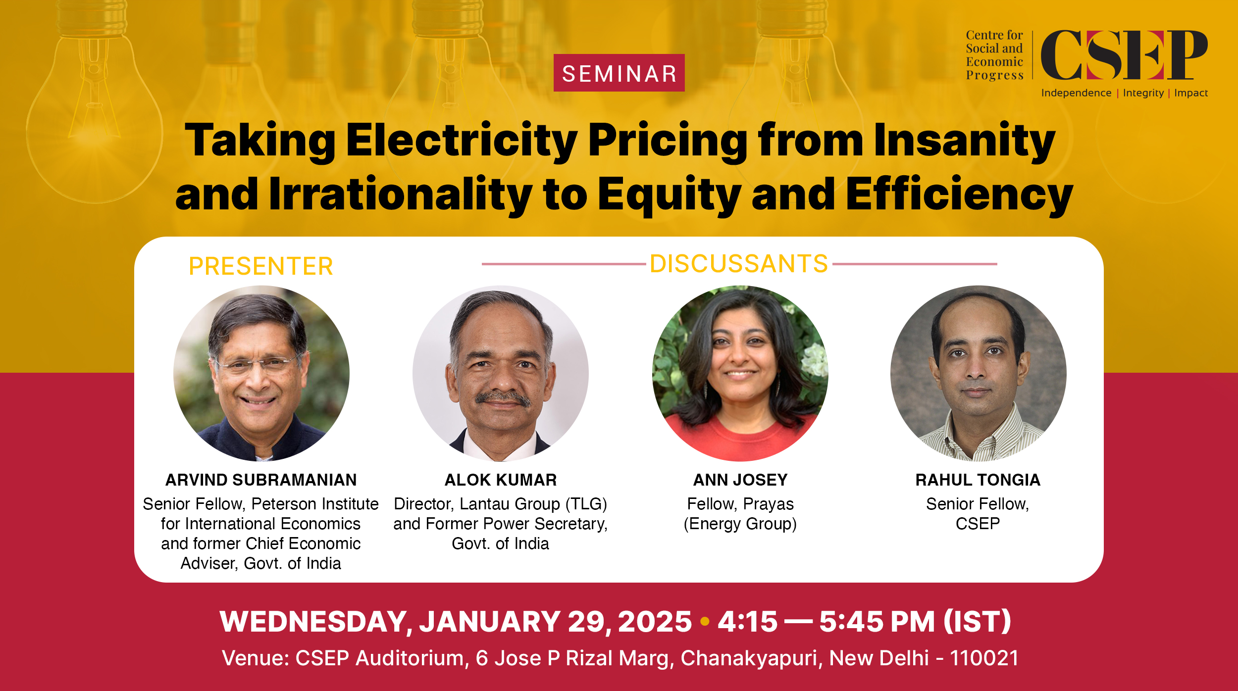 The Centre for Social and Economic Progress (CSEP) hosted a seminar titled “Taking Electricity Pricing from Insanity and Irrationality to Equity and Efficiency” on Wednesday, January 29, 2025.