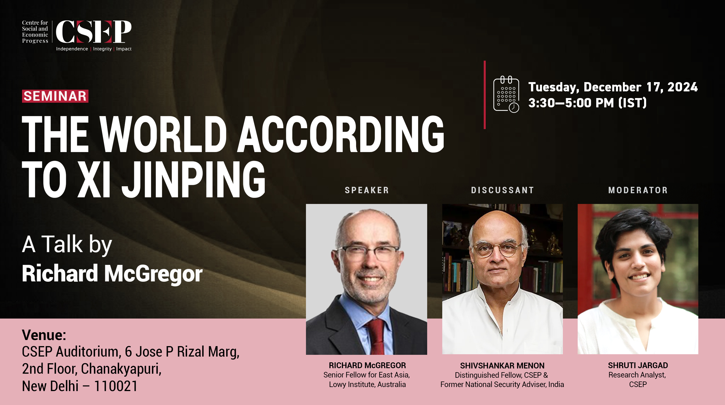 The Centre for Social and Economic Progress (CSEP) hosted a seminar titled “The World According to Xi Jinping” on Tuesday, December 17, 2024. The seminar featured a talk by Richard McGregor, Senior Fellow, East Asia, Lowy Institute, Australia, followed by a discussion with Shivshankar Menon, Distinguished Fellow, CSEP and Former National Security Adviser, India. The event was moderated by Shruti Jargad, Research Analyst, CSEP.
