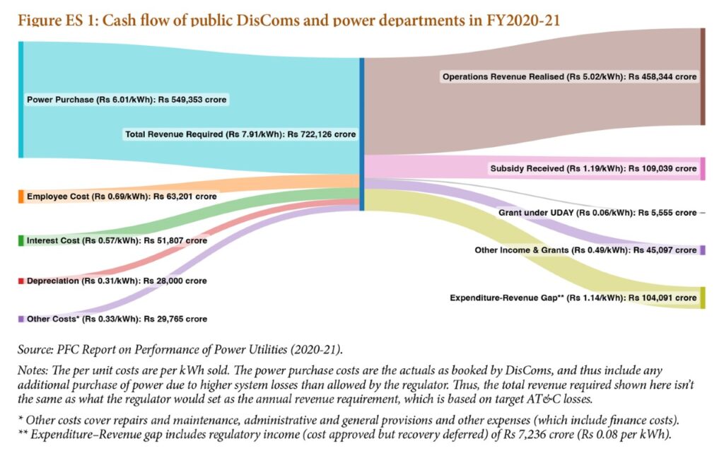 Over a 15-year period, with few exceptions, all DisComs have had revenues lower than costs. Consumers don’t pay all the costs directly, and state governments routinely offer tariff subsidies on top of the regulator-set prices (tariffs). Outside these combined revenues, DisComs also rely on significant Other Income and Grants, but this still left a cash-basis gap of Rs 1,04,091 crore in FY2020-21, or Rs 1.14 per kWh sold (Figure ES 1).[2]