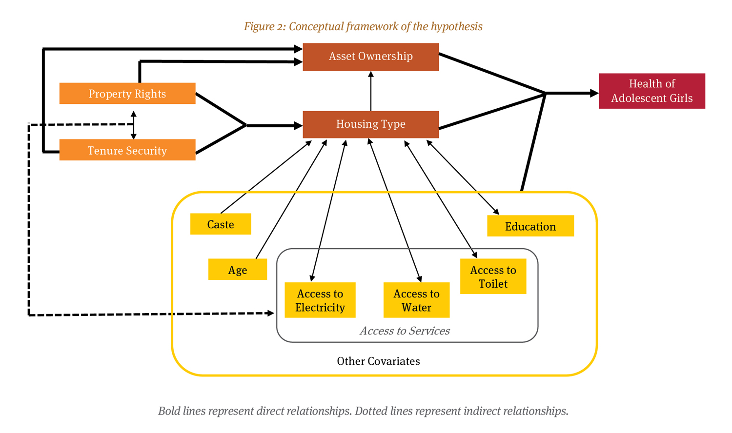 We believe that this is a first-of-its-kind study from India that has attempted to address a major evidence gap in terms of linking property rights with health outcomes of adolescent girls, a group that roughly comprises seven percent of the total population (Office of the Registrar General & Census Commissioner, India [ORGI], 2020). Though the TAG survey does not provide us information on the property rights enjoyed by these households, literature that we have discussed earlier establishes a relationship between type of housing  and property rights, and between property rights and home improvements. This, therefore, allows us to safely assume that those living in pucca houses in this study have a greater probability of enjoying secure tenure in the least and property rights in the best-case scenario. Similarly, we can safely assume that kuccha houses have a greater probability of having insecure tenure. Our findings on type of housing as influencing health outcomes are significant in that they underline the importance of decent housing to health outcomes. Our research can therefore be interpreted as making a case in the least for the underlying importance of decent housing with adequate access to basic services such as water and toilets. Secure tenure can motivate poor households to improve their homes, and thereby result in positive health outcomes.